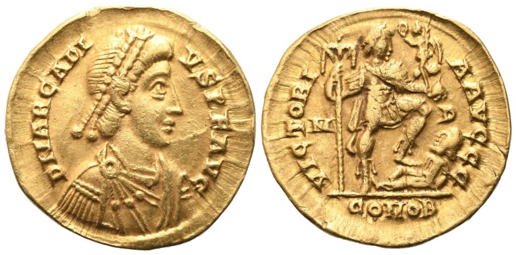 D N ARCADI - VS P F AVG Diademed, draped and cuirassed bust right; Rv. VICTORI A AVGGG, M-D, Arcadius standing right, with left foot on bound captive to right, holding labarum in right hand and crowning Victory on globe in left; COMOB in exergue. RIC X 1205. Good very fine.