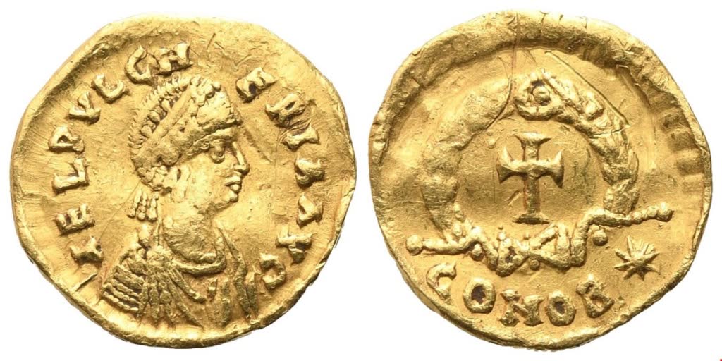 AEL PVLCH-ERIA AVG Pearl-diademed, draped bust of Aelia Pulcheria r.; Rv. Cross within wreath; CONOB * in exergue. RIC X 334. Very rare. Very fine.