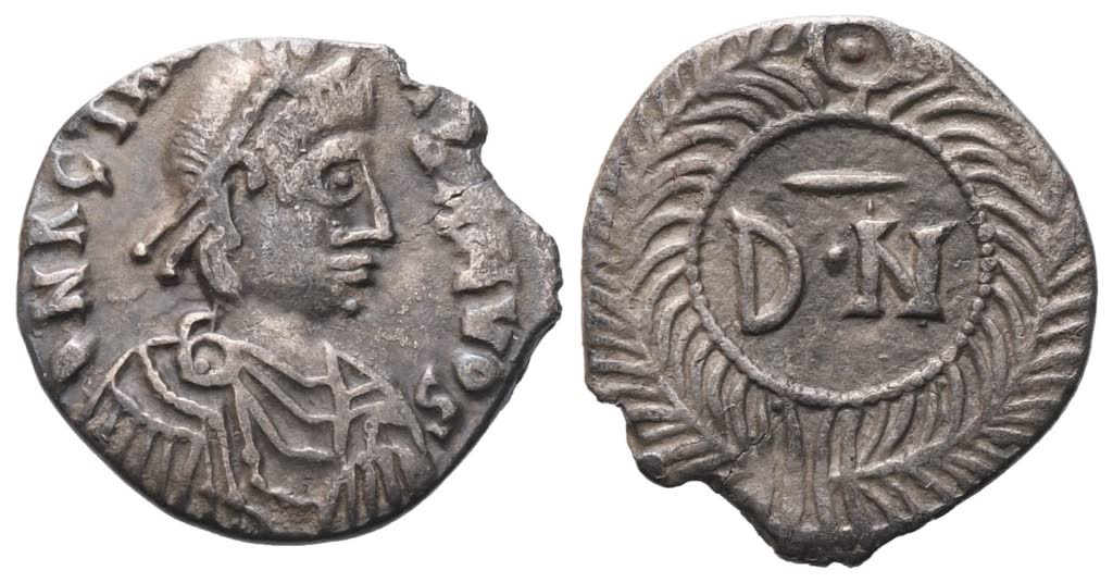 D N R GTHA – BANVDS (?) Pearl-diademed, draped and cuirassed bust r.; Rv. D – N in laurel wreath. BMC Vandals 3-7. MIB 3. MEC I, 8. Rare. Fine style, good very fine / near extremely fine.