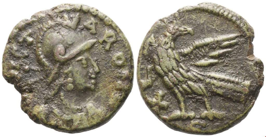 INVICT – A ROMA Helmeted, draped and cuirassed bust of Roma r.; Rv. Eagle standing l. with open wings; in l. field, XL; Є in exergue. MIB 74 a; MEC I, 102. Good very fine. Nice green patina.