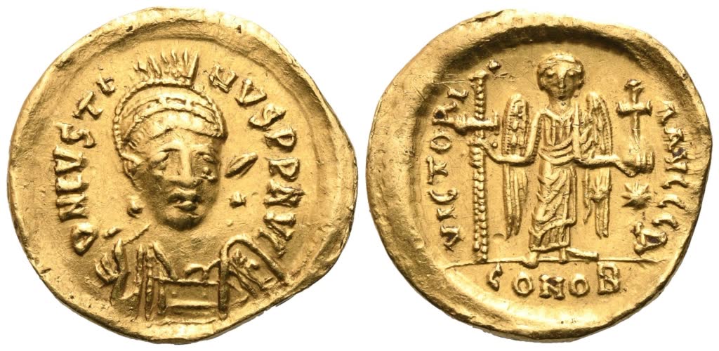 D N IVSTI - NVS PP AVG Pearl-diademed, helmeted and cuirassed bust of Justin facing, head slightly r., holding spear over r. shoulder and on l. arm shield with horseman motif; Rv. VICTORI-A AVCCC A Angel standing facing, holding long cross and globus cruciger; star in r. field; CONOB in exergue. DOC 2a; MIB 3; SB 56. Good very fine / about extremely fine.