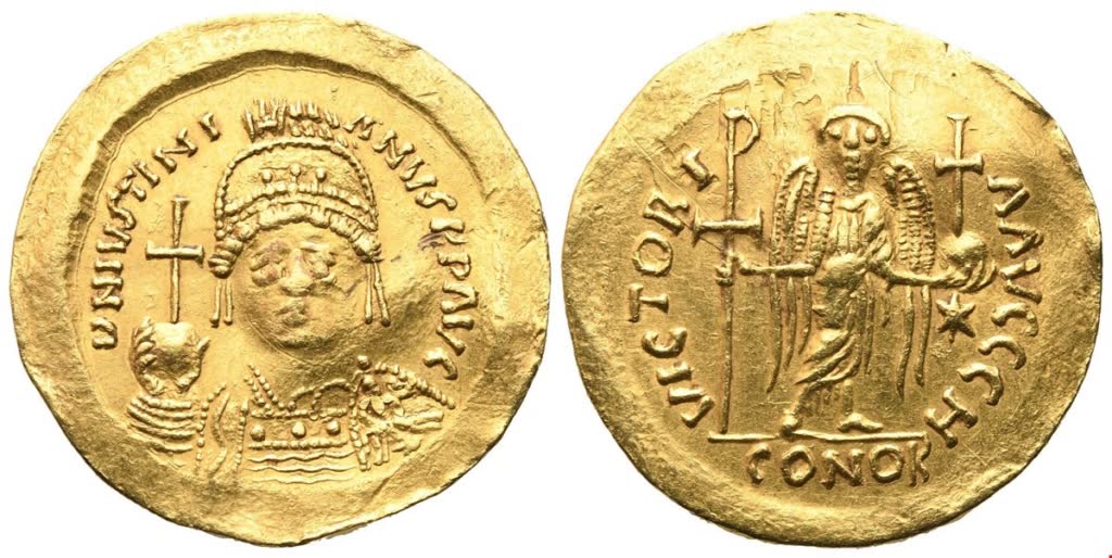 D N IVSTINI - ANVS P P AVC Helmeted and cuirassed bust facing, holding globus cruciger and shield decorated with horseman motif.; Rv. VICTORI - A AVCCC H Angel standing facing, holding long staff surmounted by staurogram and globus cruciger; star in r. field; CONOB in exergue. DOC 320c; MIBE 34; SB 291. Rare. Very fine / good very fine.