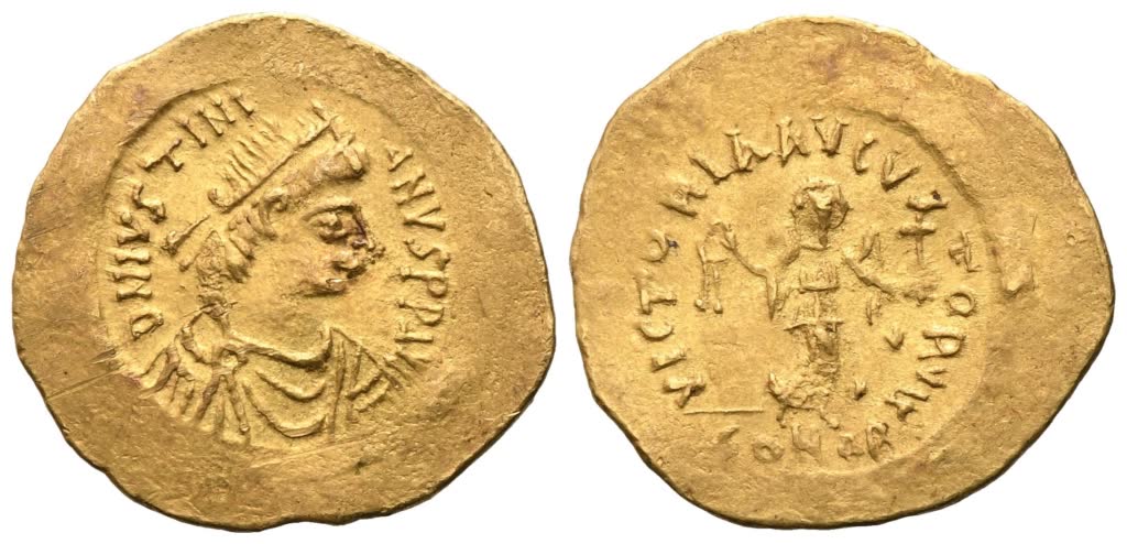D N IVSTINI-ANVS PP AVG Pearl-diademed, draped and cuirassed bust of Justinian r.; Rv. VICTORIA AVGVSTORVN, Victory advancing to r., head, in r. hand holds wreath, in l. hand a globe cruciger, star in r. field; CONOB in exergue. DOC 19; MIBE 19; SB 145. About extremely fine.