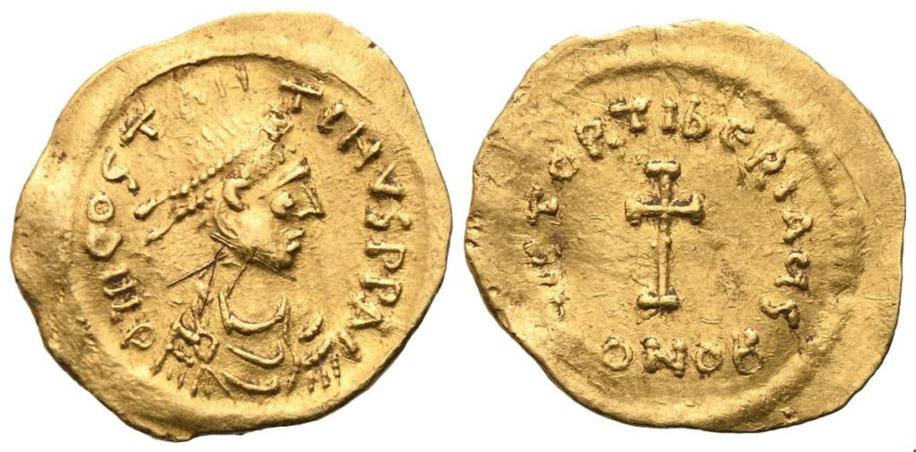 Dn COSTANTINVS P P A Diademed, draped and cuirassed bust of Tiberius II r.; Rv. VICTORI TIbЄRI AVS, cross potent; CONOB in exergue. DOC 7a; MIBE 9b; SB 425. Very fine.