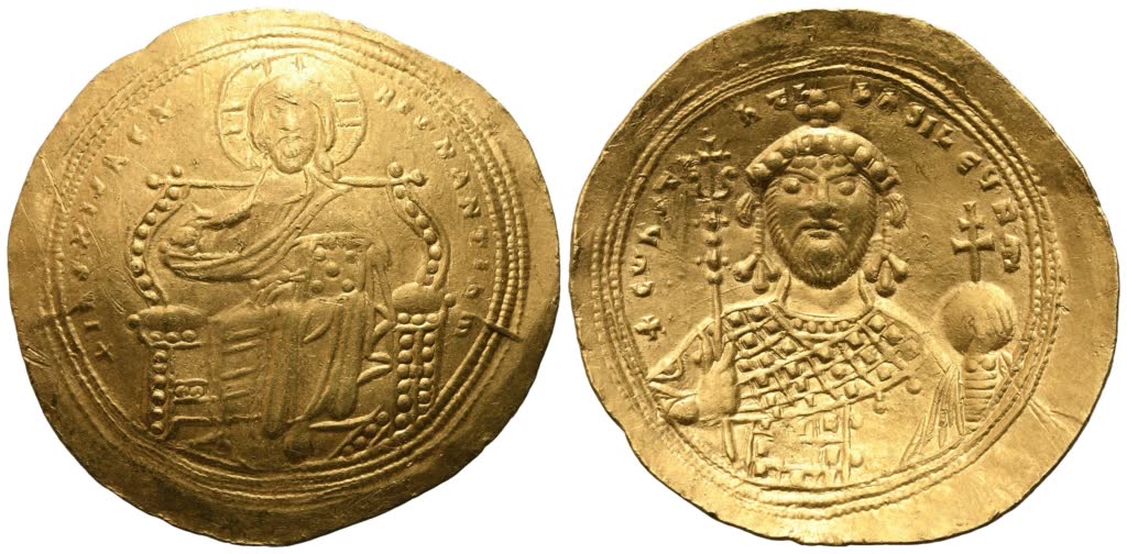 +hIS XIS RЄX RЄςNANTIҺm Christ seated on lyre-backed throne facing, nimbate, wearing pallium and colobium, raising his r. hand in benediction and holding book of gospels in his l.; Rv. + CⲰnSTAnTn bASILEЧS Rm Bust of Constantine IX facing, wearing loros and crown with pendilia, holding labarum in his right hand and globus cruciger in his l.. DOC 2b. SB 1829. Extremely fine.