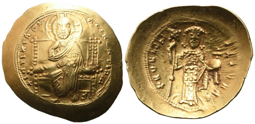 + IhS XIS REX REGNANTInm Christ, nimbate, seated on square-backed throne, raising hand in benediction and holding Gospels; Rv. + Kωn RAC Λ O ΔOVKAC Emperor standing facing on cushion, holding labarum and globus cruciger; pellet on labarum shaft. DOC 1b; Sear 1847. Extremely fine.