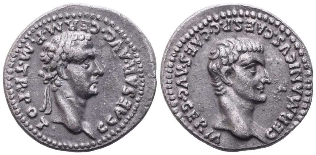 C CAESAR AVG GERM P M TR POT Laureate head of Gaius r.; Rv. GERMANICVS CAES P C CAES AVG GERM Bare head of Germanicus r. Cf. RIC I 18 (for prototype). Hill 151. Cf. Giessener Münzhandlung Auktion 30 (19-20 November 1984), lot 3108.