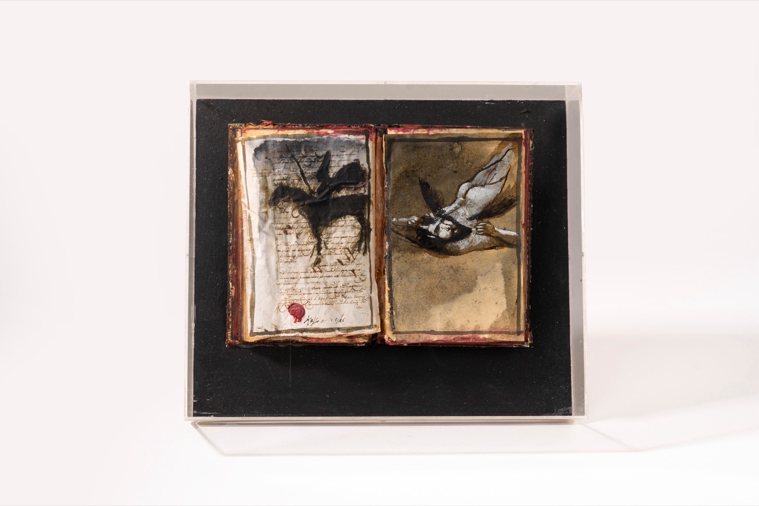 tecnica mista e collage su carta applicata su tavola e contenuta entro teca in plexiglass