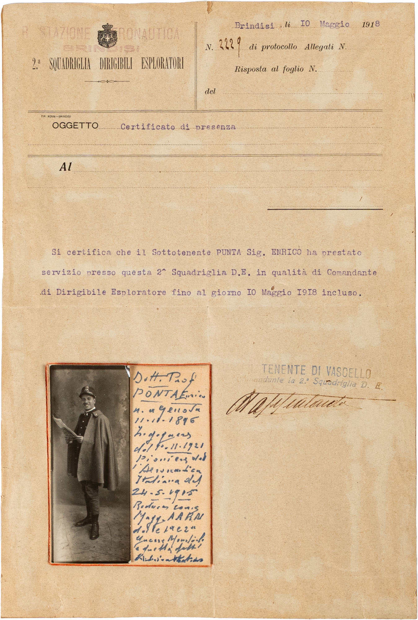 WWI - 2^ Squadriglia Dirigibili Esploratori - Certificato di Presenza10 Maggio 191821 x 31 cm. ca.Pochi i documenti simili ancora esistenti; pochissimi furono i sopravvissutiCondizioni generali buone