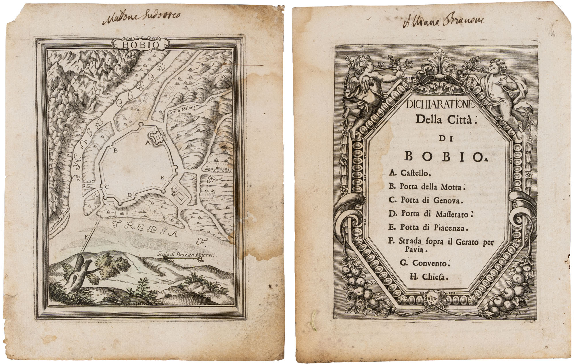 Mappa Sistema di Fortificazione della cittadina di Bobbio (Bobio)Due fogli incisi in rame19 x 25 cm. ca.Tratto dal volume G. B. Sesti - Piante delle città, piazze e castelli fortificati in questo Stato di Milano con le loro dichiarazioni - ed. Agnelli 1707Condizioni generali buone