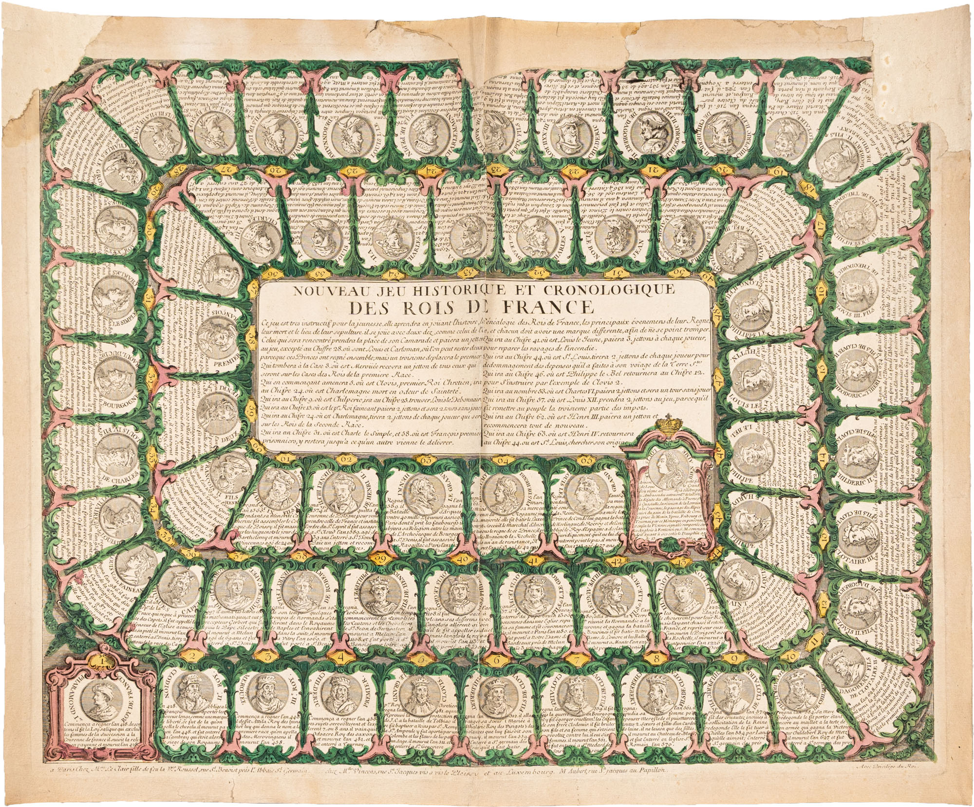 GIOCO DELL'OCA SETTECENTESCO1770 ca.Gioco dell'oca francese a colori databile alla seconda metà del XVIII secolo750 x 500 ca.Veniva utilizzato per insegnare ai giovani nobili di corte la storia dei sovrani di Francia. Ogni casella del gioco è dedicata, in ordine cronologico, ad un sovrano franco/francese, partendo dal capo franco Faramond (del IV secolo), fino a Luigi XV. Segni del tempo e piccoli restauri, peraltro esemplare in buono stato di conservazione