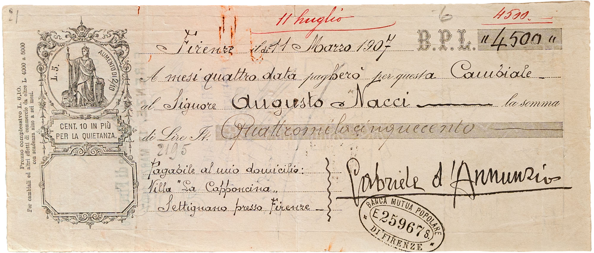 Gabriele D'Annunzio, principe di Montenevoso - Cambiale di lire 4.500 onorata dal vateLa cambiale porta la data marzo 1907Da notare l'indirizzo dello scrittore, 'Villa la Capponcina' Settignano presso Firenze, dimora molto amata e vissuta anche con Eleonora Duse per oltre 10 anni. L'affitto annuale richiesto dal marchese Viviani della Rocca per la villa era di 1.000 lireOttime condizioni