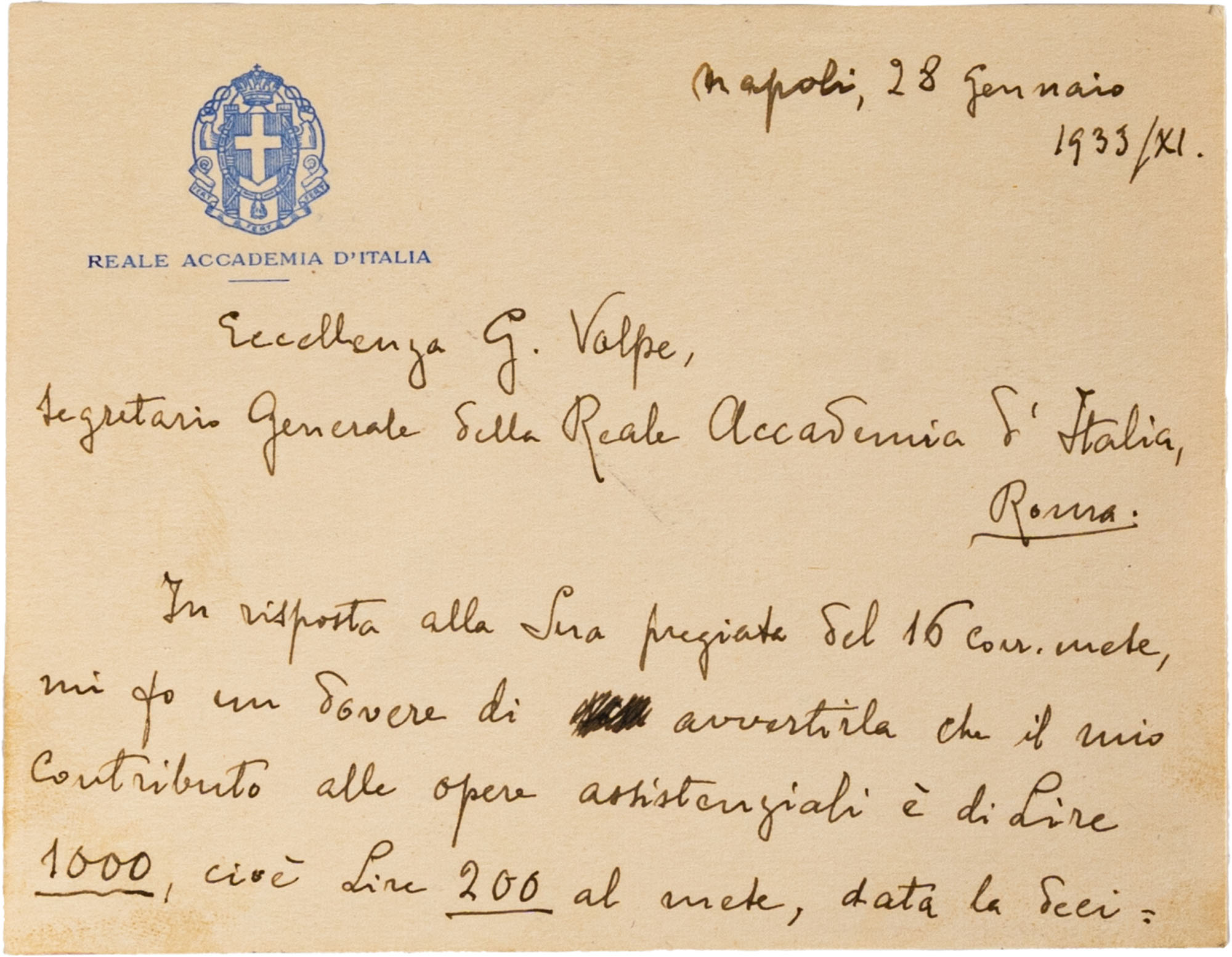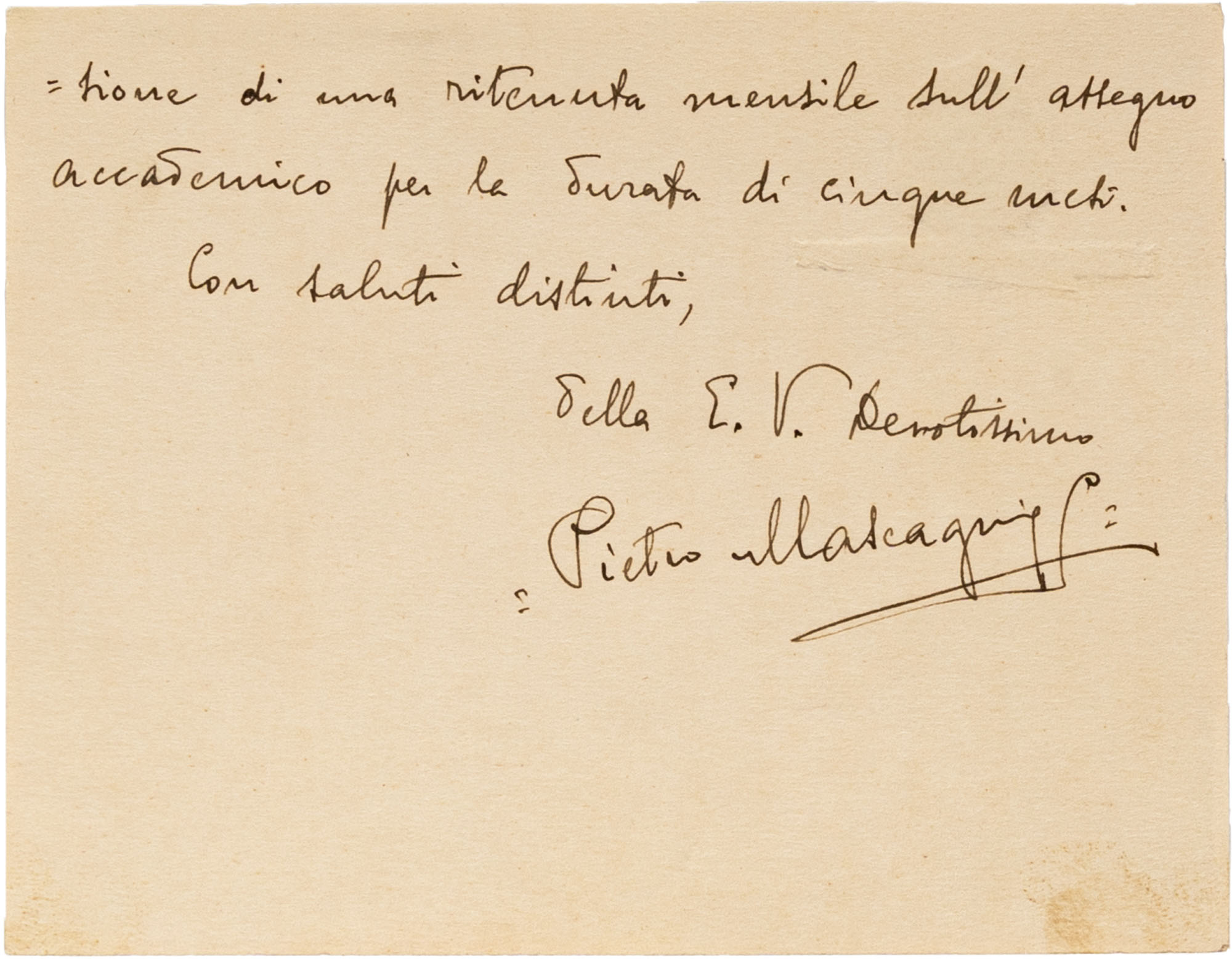 Pietro Mascagni - Bel biglietto intestato Reale Accademia d'Italia totalmente autografo con firma di pugno del maestroDatato 28 gennaio 1933Cm. 14 x 11Argomento contributo opere assistenzialiCondizioni ottime