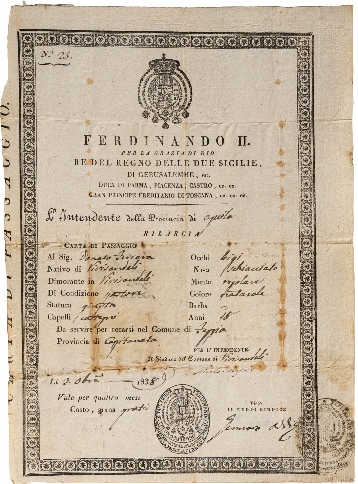 Ferdinando II, Re del Regno delle due Sicilie - Carta di Passaggio valevole per 4 mesiIntendente provincia di Aquila, 1838Interessanti i titoli del Re (territori molto lontani dal Regno delle due Sicilie) e i connotati del richiedente, espressi con termini oggi desueti e curiosi