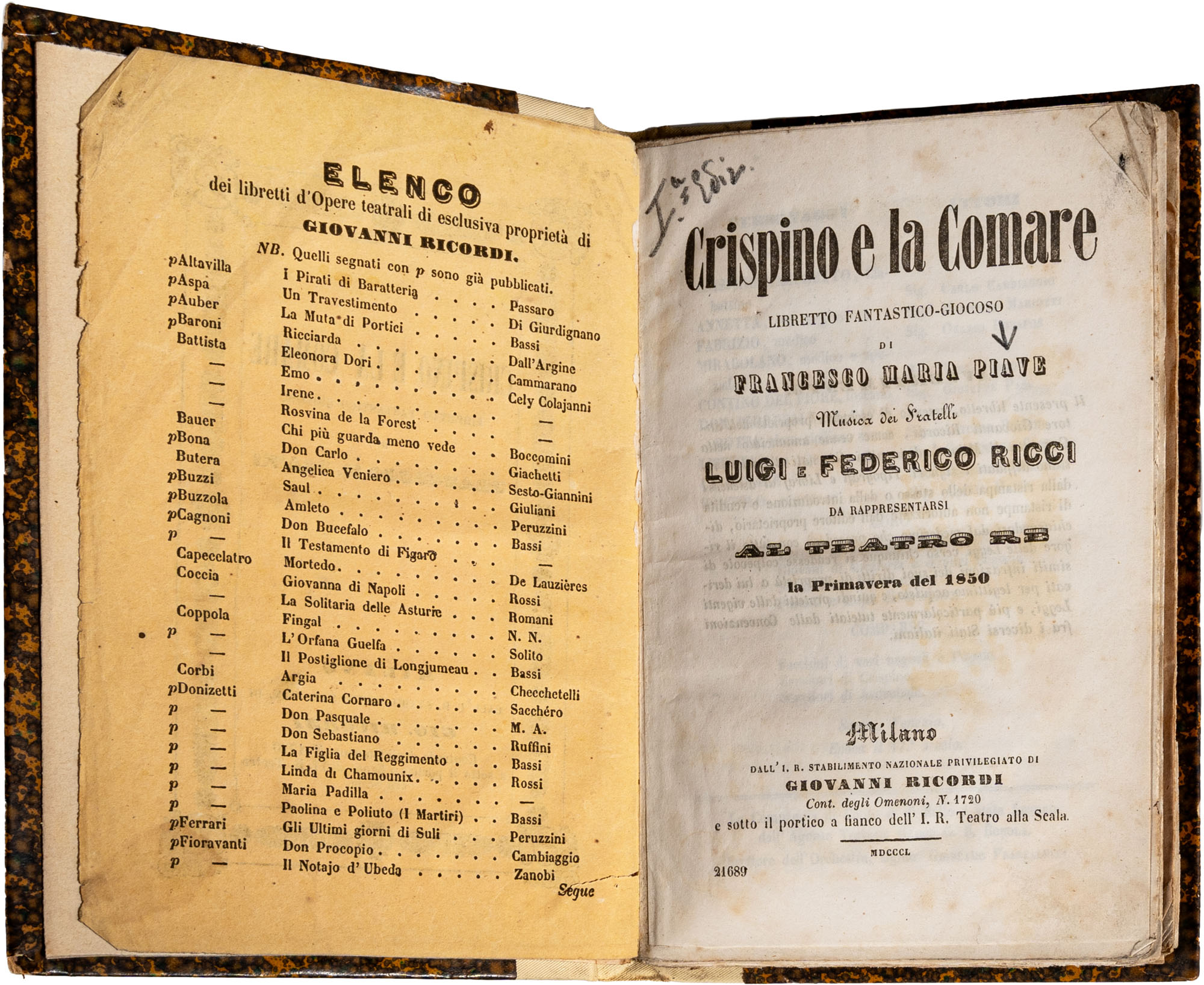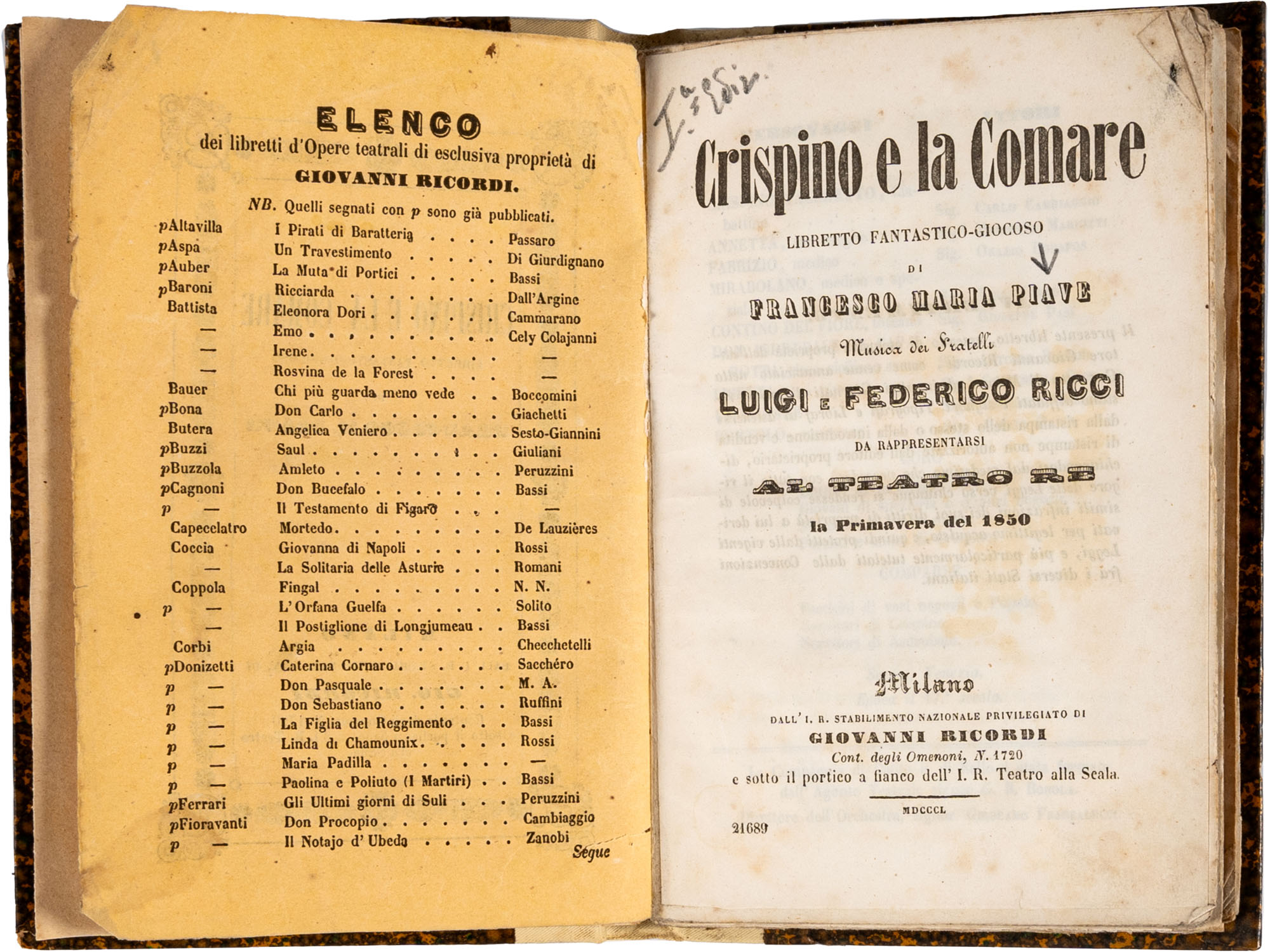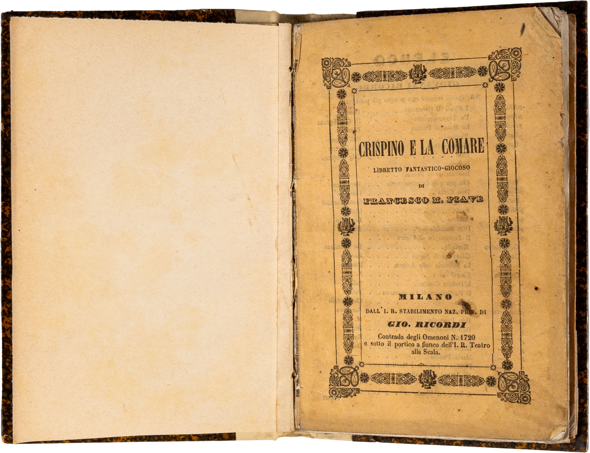PIAVE FRANCESCO MARIA - CRISPINO E LA COMARE. LIBRETTO FANTASTICO-GIOCOSO. MUSICA DEI FRATELLI LUIGI E FEDERICO RICCI, DA RAPPRESENTARSI AL TEATRO RE LA PRIMAVERA DEL 1850.Milano, DALL'I.R. STABILIMENTO NAZIONALE PRIVILEGIATO DI GIOVANNI RICORDI, 1850Legatura in mezza tela moderna, titolo al dorso manoscritto, brossura editoriale conservata all'interno della legatura, pp. 59. Libretto d'opera di metà ottocento, riporta anche i nomi degli attoriIn-16 gr. (mm. 170 x 115)Esemplare lievemente fiorito, peraltro testo in buono stato di conservazione