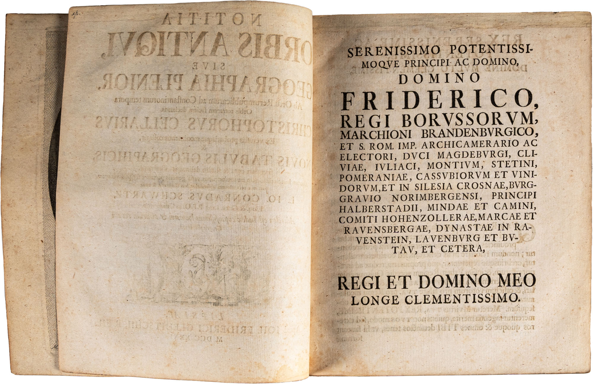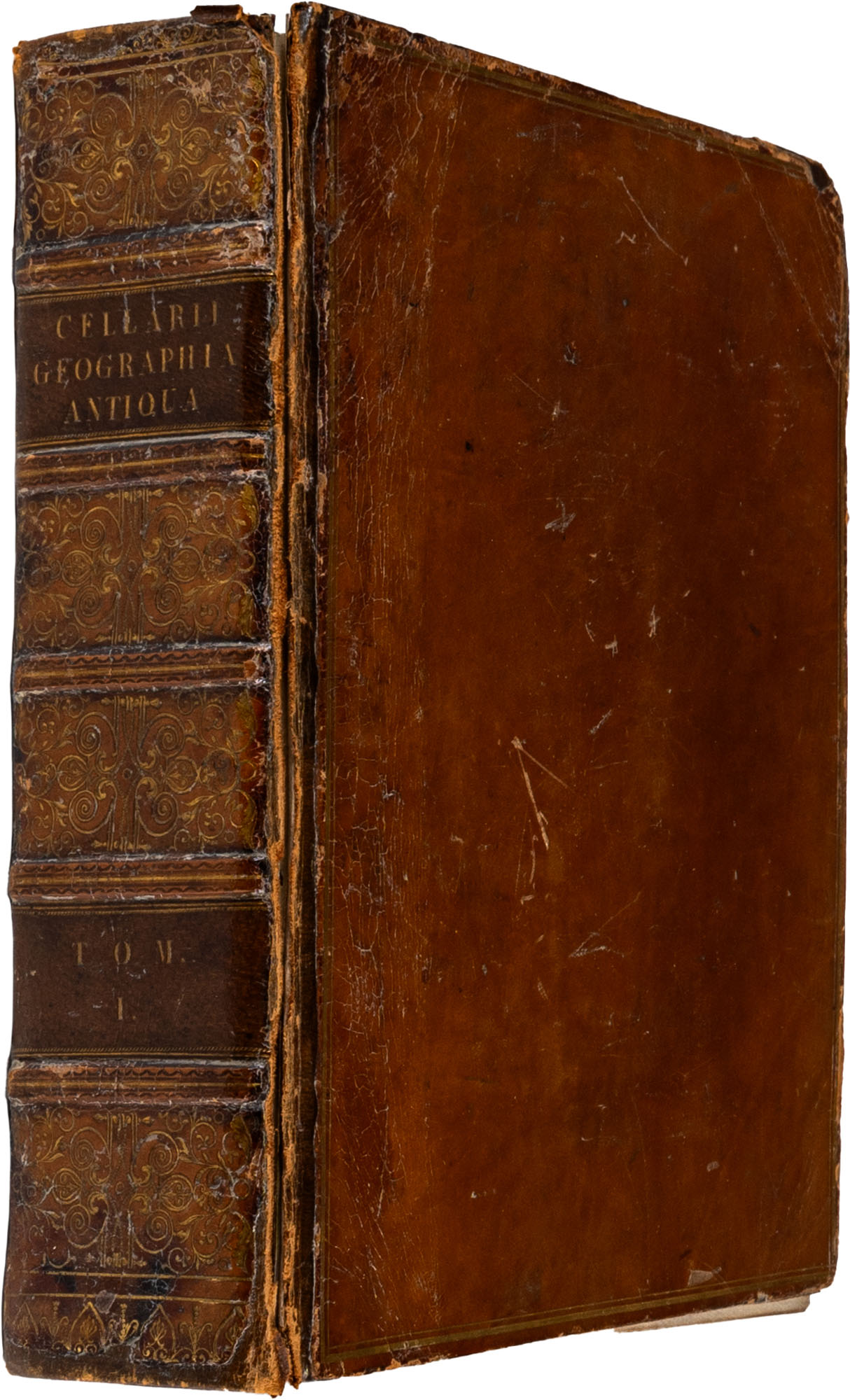 SCHWARTZ CONRADUS - NOTITIA ORBIS ANTIQUI SIVE GEOGRAPHIA PLENIORLipsiae, IOH. FRIDERICI GLEDITSCHII, B. FIL., 1731Legatura in piena pelle coeva con decorazioni oro ai piatti, titolo (in tassello) e ricchissimi fregi oro al dorso (a cordoni), tagli marmorizzati, pp. 11 (nn.), 1088, 56 (nn.). Illustrato con diverse carte geografiche ripiegate, illustrazioni nel testo e un ritratto all'occhiettoIn-8 p. (mm. 234 x 190)Piatto anteriore saltato, peraltro esemplare in buono stato di conservazione