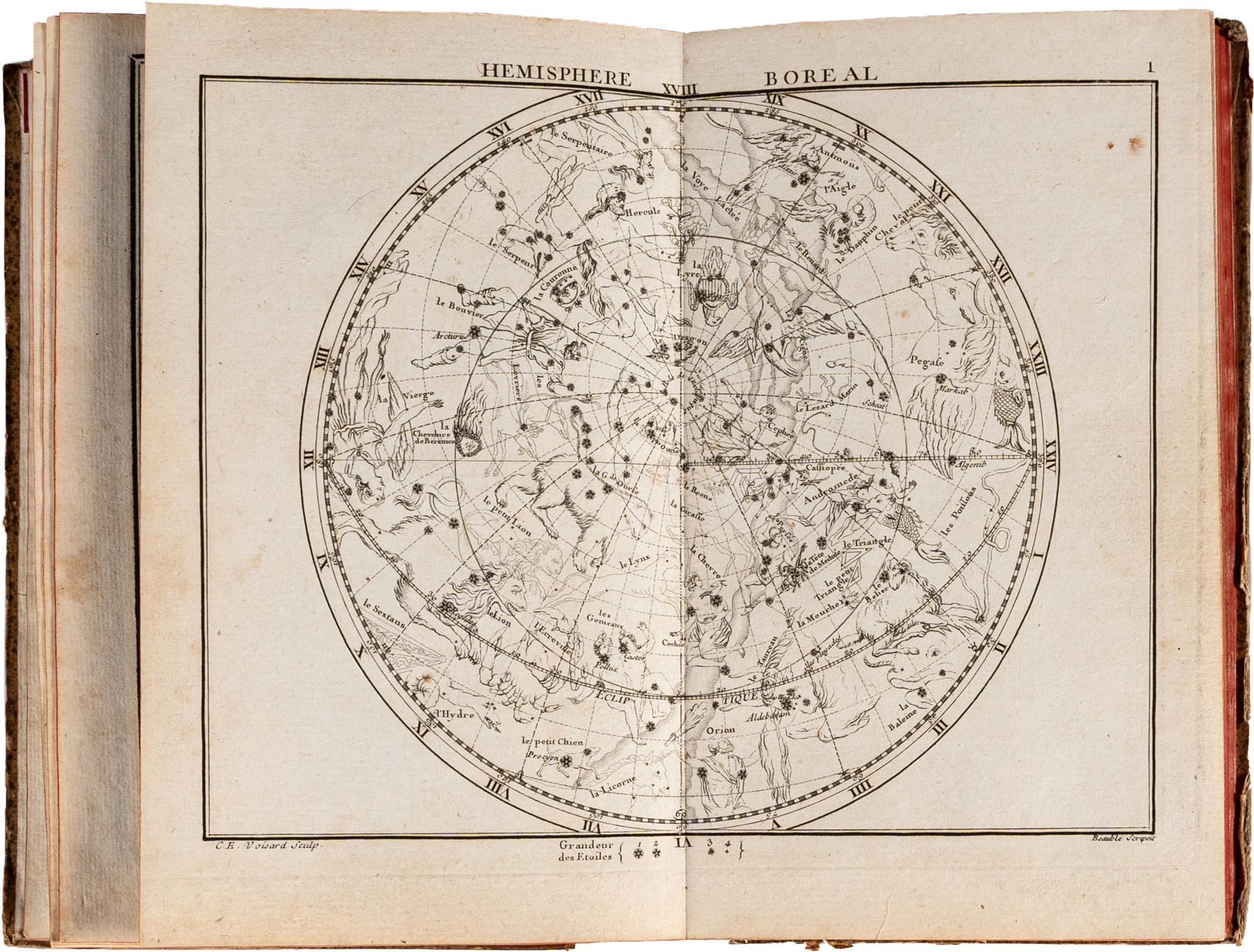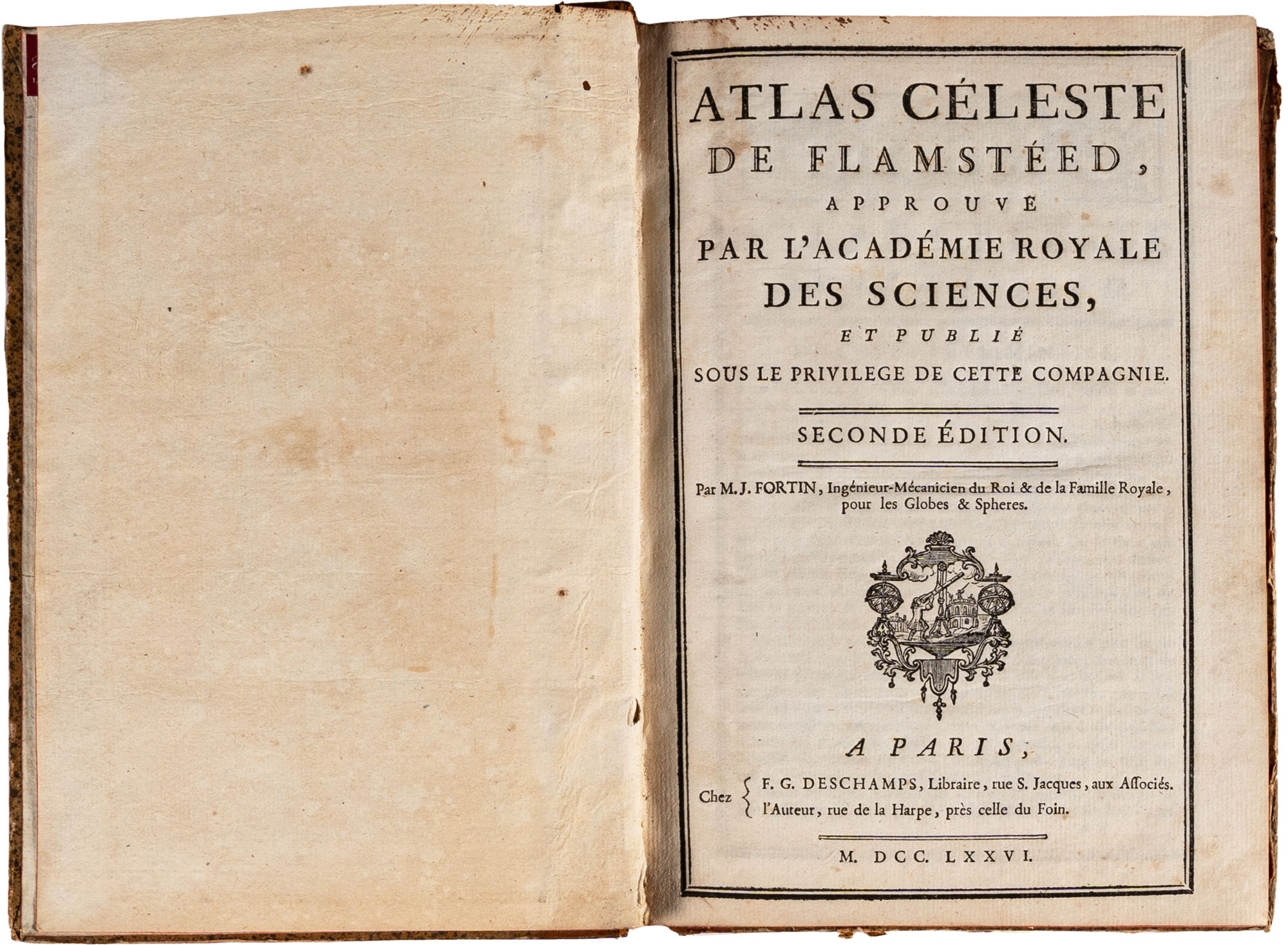 Jean Fortin - Atlas celesteMezza pelle coeva, pagg. 8+40+30 bellissime tavole in rame a doppio foglioCm. 25 x 22Celebre atlante celeste per opera di John Flamsteed, astronomo della casa Reale d'Inghilterra e fondatore della specola di Greenwich, nella versione del francese Fortin. Le tavole, ci mostrano le varie costellazioni con le immagini mitologiche, queste sono 26, le altre con Emisfero Boreale, 2 con l'Emisfero Australe, 1 col PlanisferoCondizioni molto buone