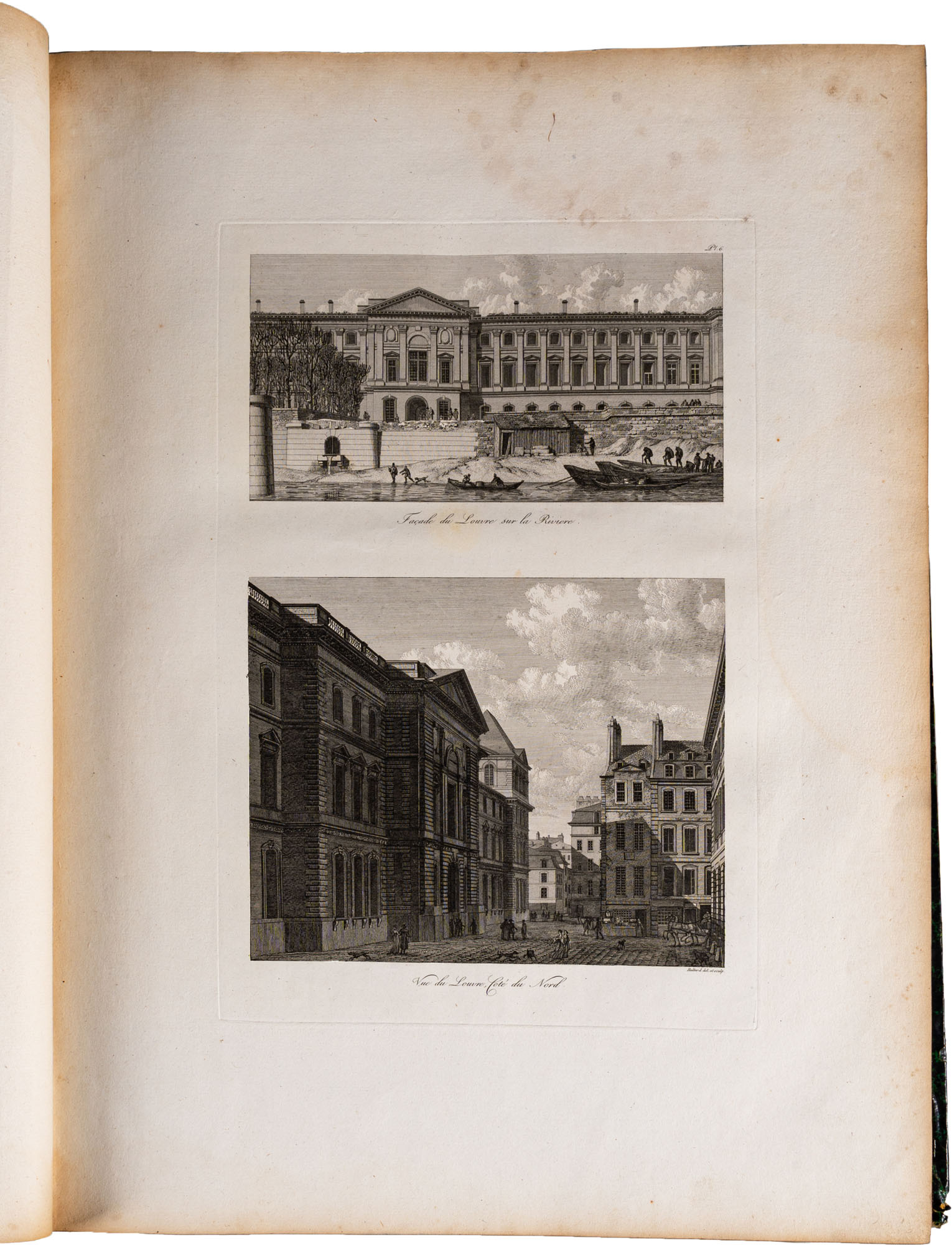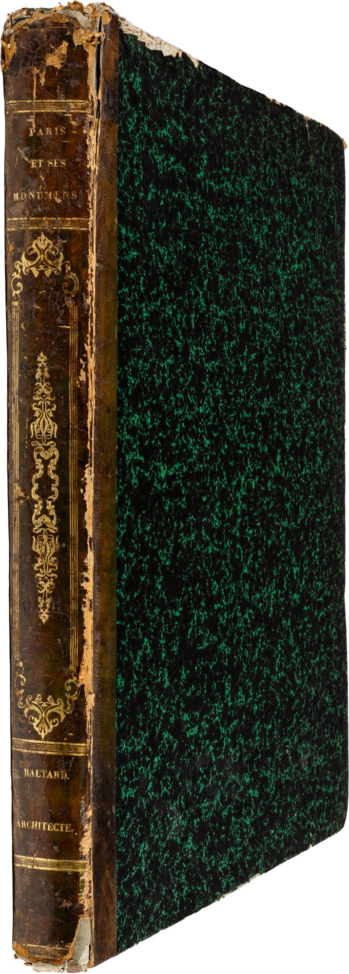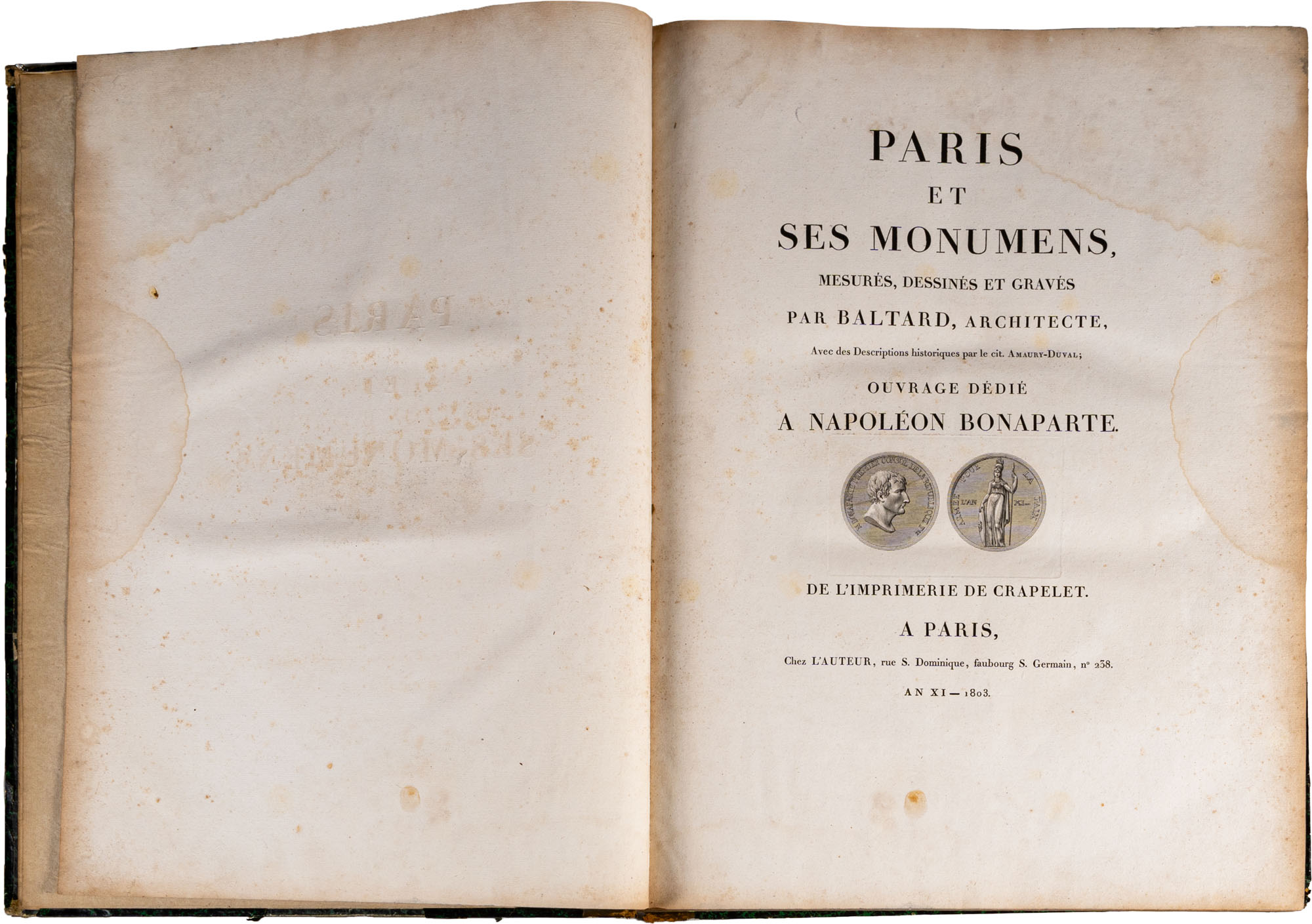 BALTARD - PARIS ET SES MONUMENS, MESURÉS, DESSINÉS ET GRAVÉS PAR BALTARD (ARCHITECTE). AVEC DES DESCRIPTIONS HISTORIQUES PER LE CIT. AMAURY-DUVAL. OUVRAGE DEDIÉ A NAPOLÉON BONAPARTEParis, CRAPELET, 1803-1805Due tomi rilegati in un volume, legatura in mezza pelle coeva, titolo e decorazioni oro al dorso, pp. 244 (complessive). In gran parte illustrato da incisioni a piena paginaIn-folio (mm. 625 x 455)Mancanze e segni d'uso al dorso e ai piatti, alcune fioritureTesto e illustrazioni in buono stato di conservazione