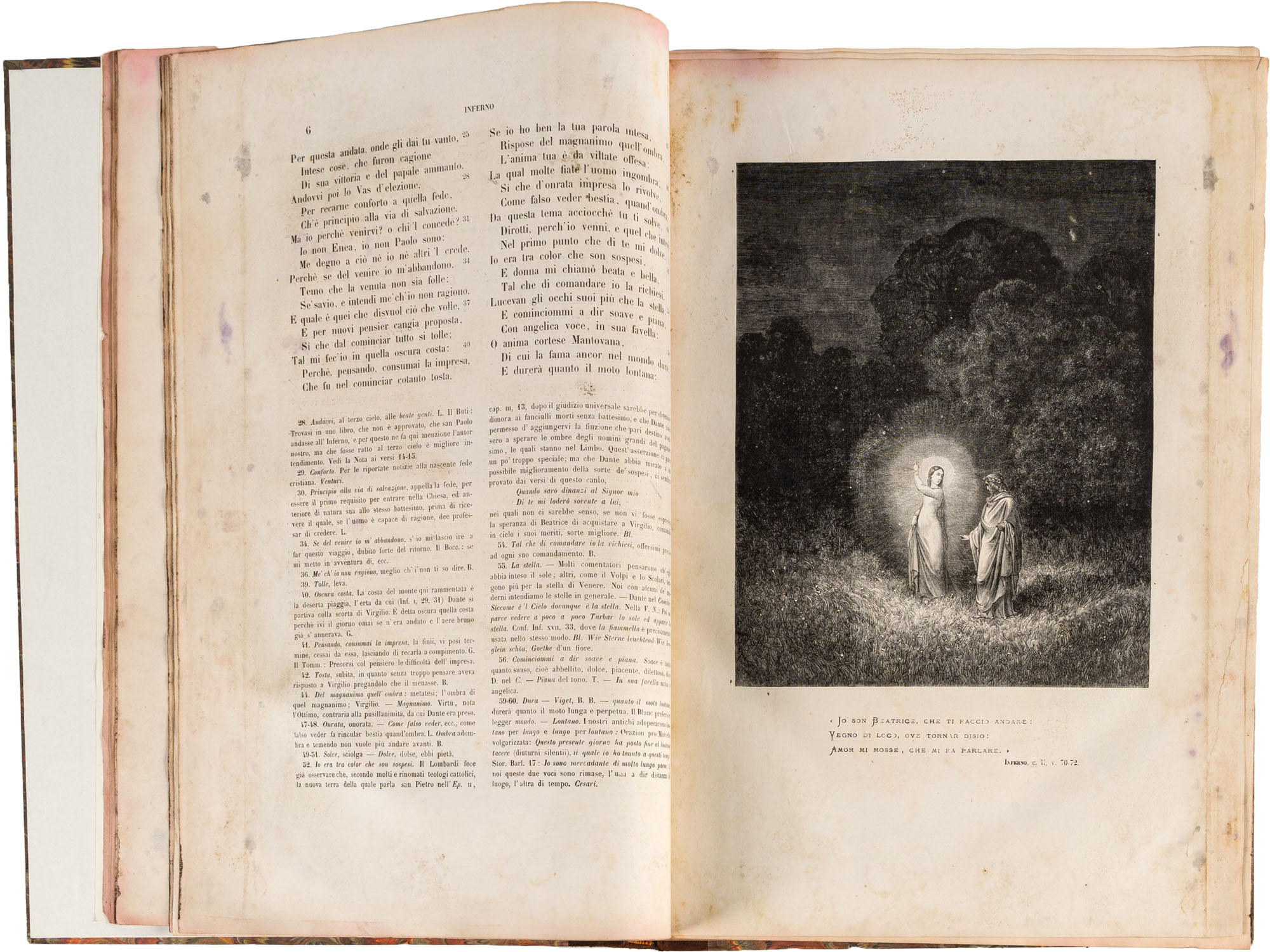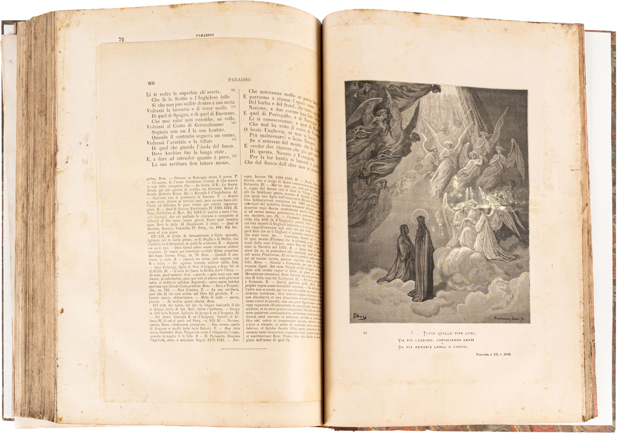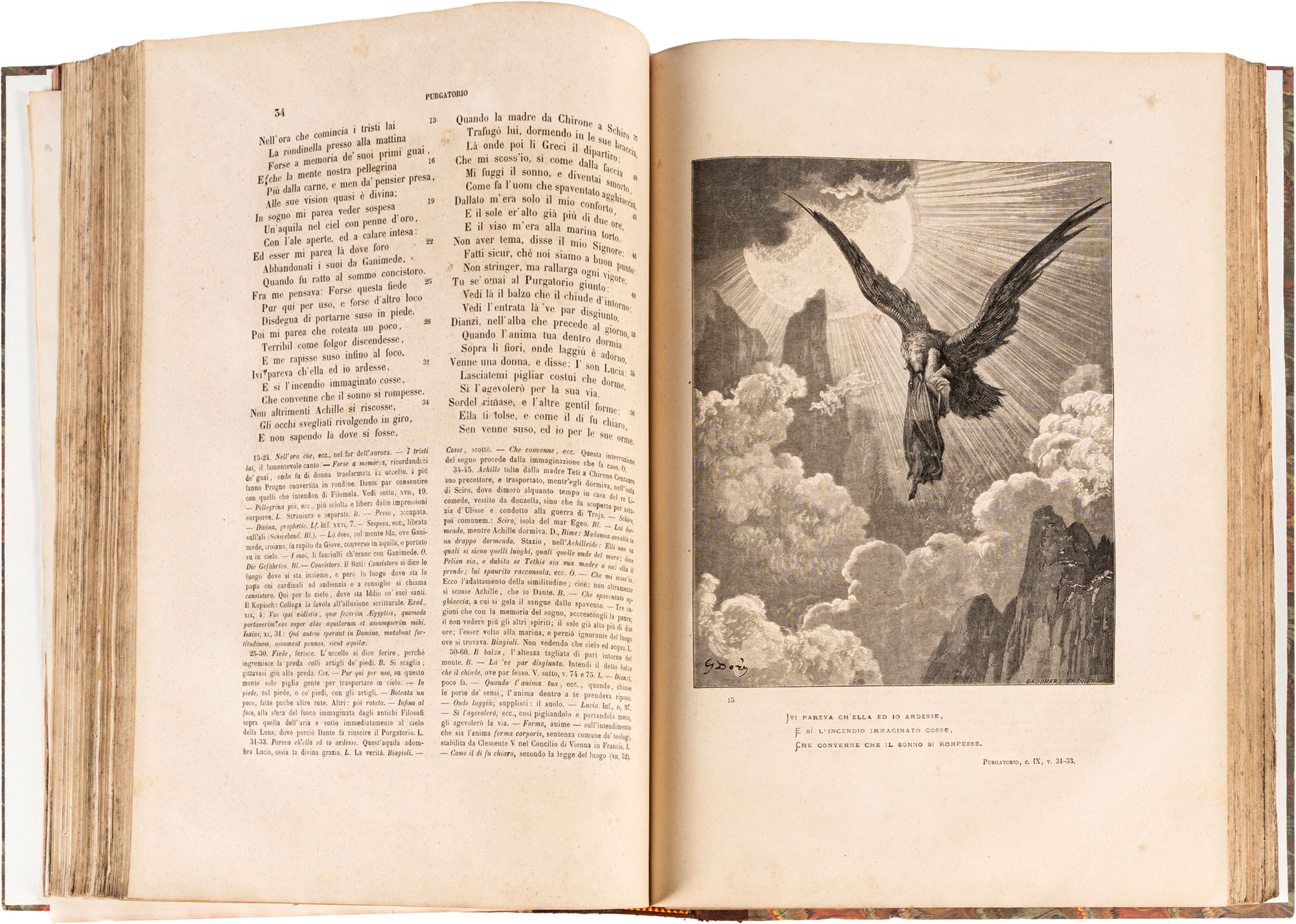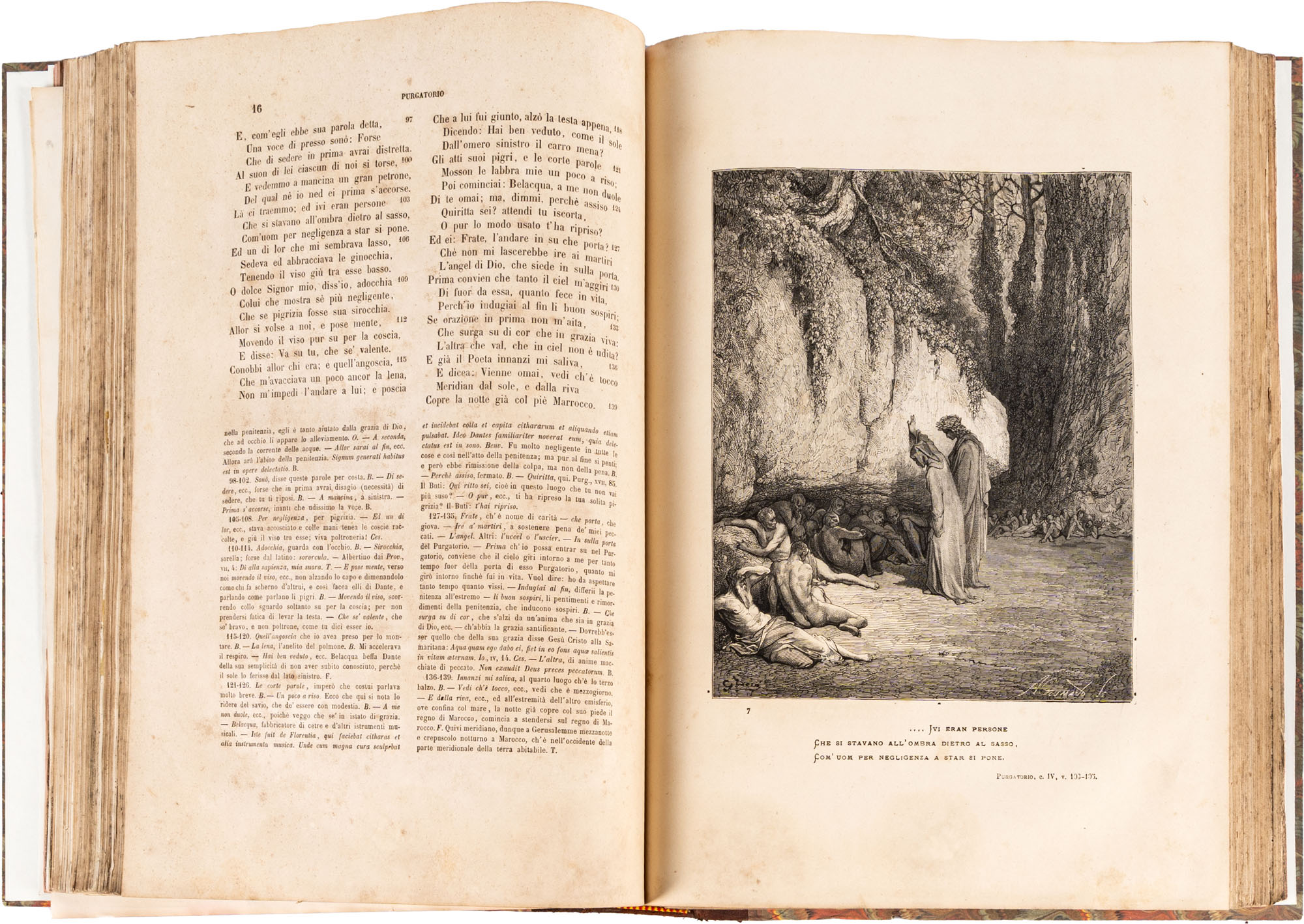 ALIGHIERI DANTE (A CURA DI EUGENIO CAMERINI) - LA DIVINA COMMEDIAMilano, SONZOGNO, 1868Legatura in mezza pelle coeva, titolo e fregi oro al dorso (a cordoni), pp. 136; 132; 132. Riccamente illustrato da 97 incisioni a piena paginaIn-folio (mm. 410 x 290)Le prime e le ultime pagine presentano vistosi aloni e bruniture, peraltro testo in buono stato di conservazione