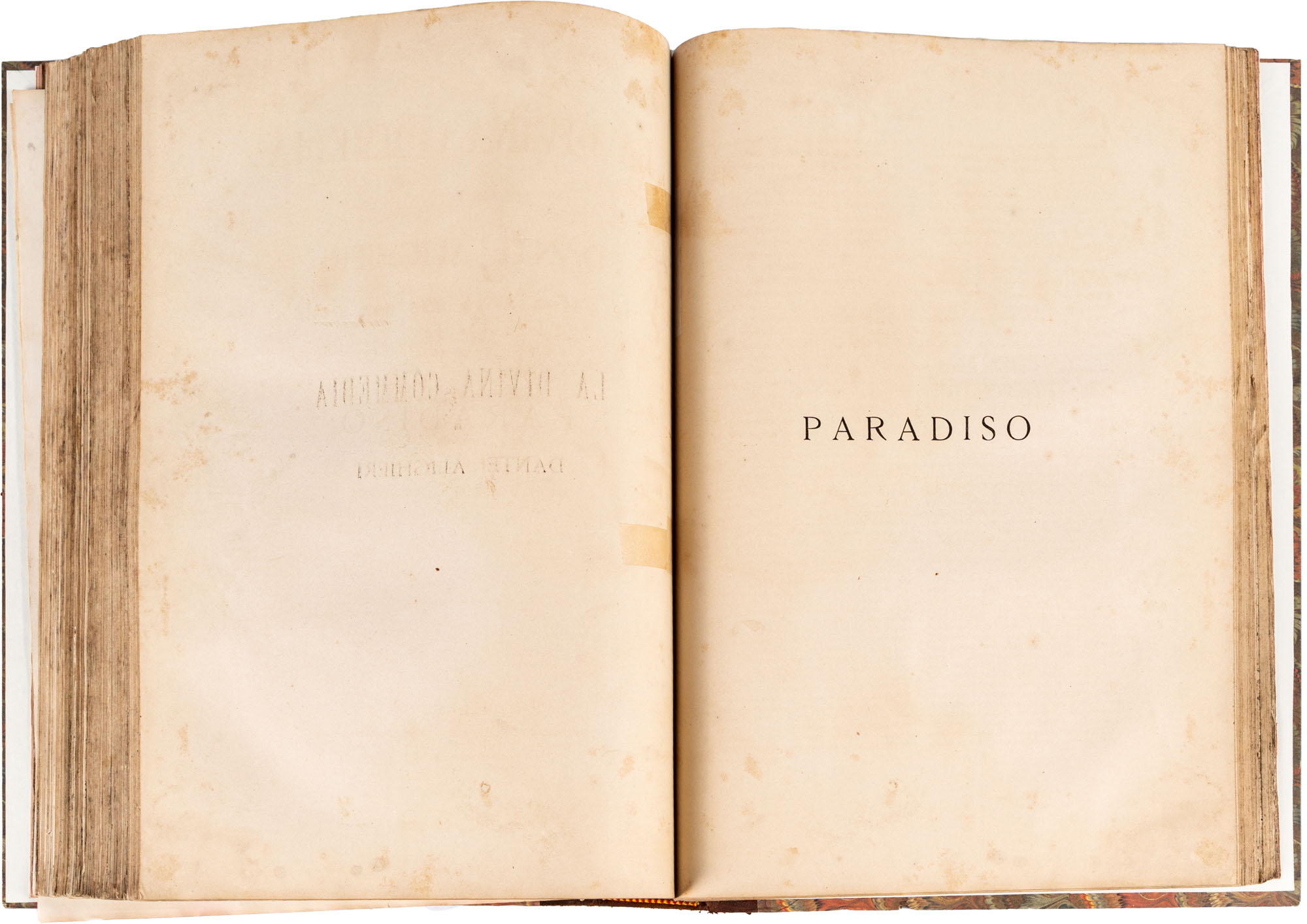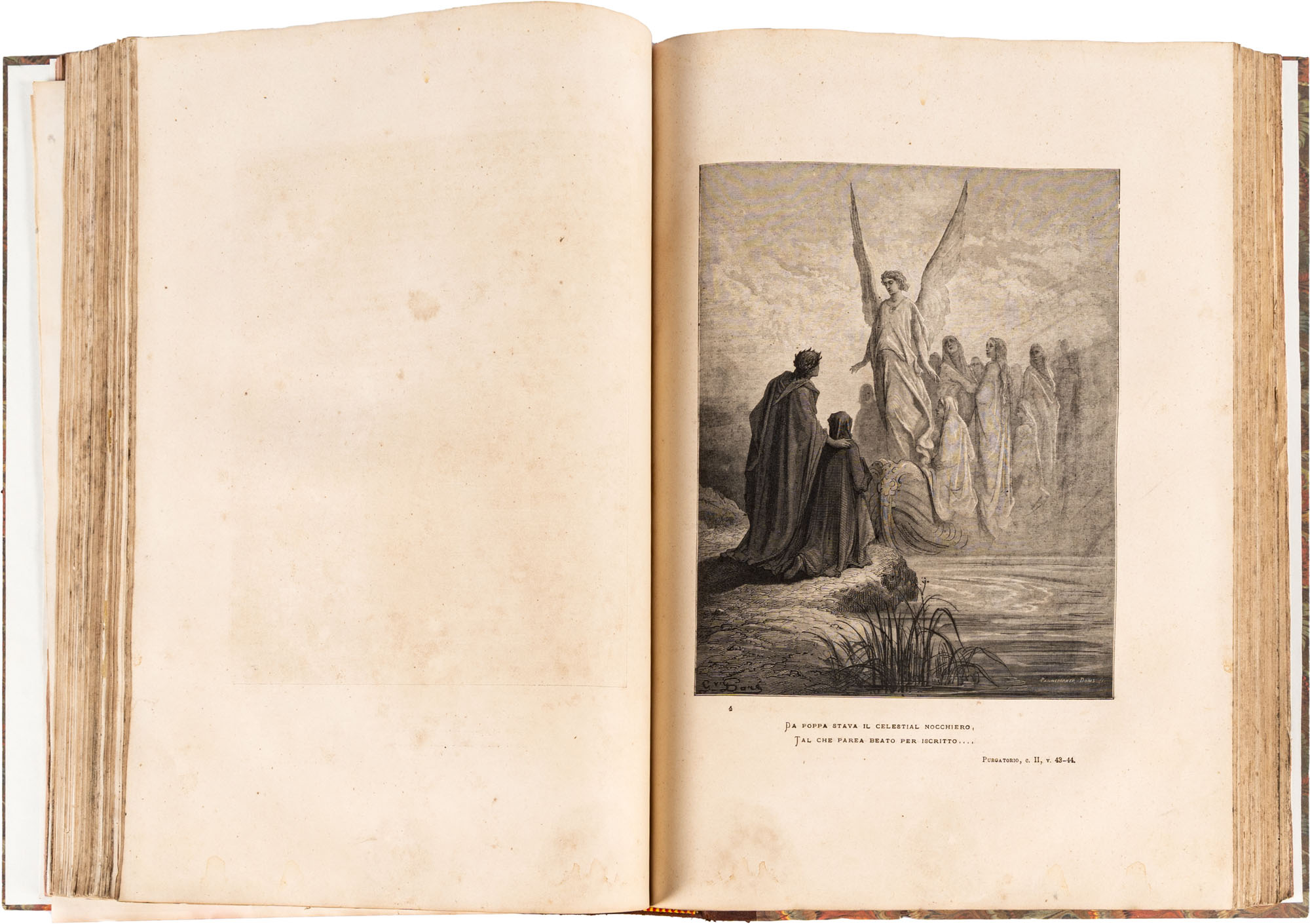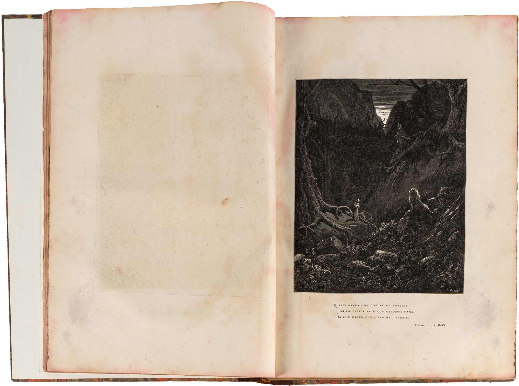 ALIGHIERI DANTE (A CURA DI EUGENIO CAMERINI) - LA DIVINA COMMEDIAMilano, SONZOGNO, 1868Legatura in mezza pelle coeva, titolo e fregi oro al dorso (a cordoni), pp. 136; 132; 132. Riccamente illustrato da 97 incisioni a piena paginaIn-folio (mm. 410 x 290)Le prime e le ultime pagine presentano vistosi aloni e bruniture, peraltro testo in buono stato di conservazione