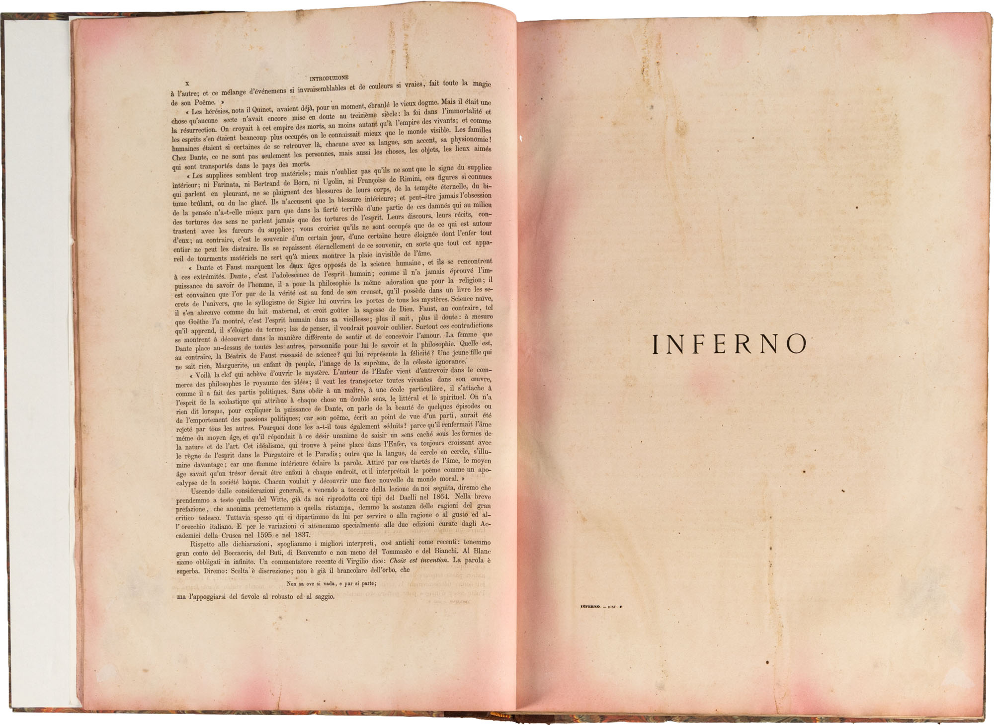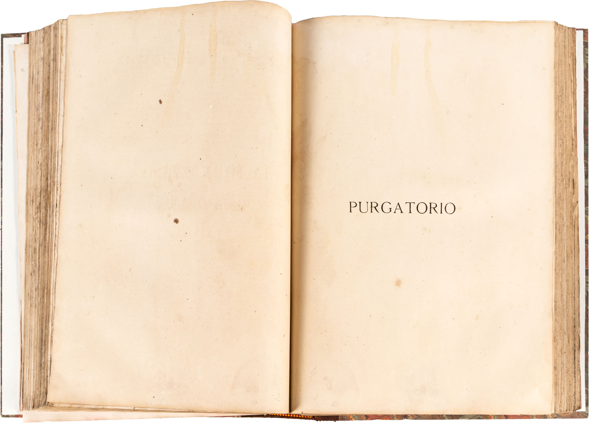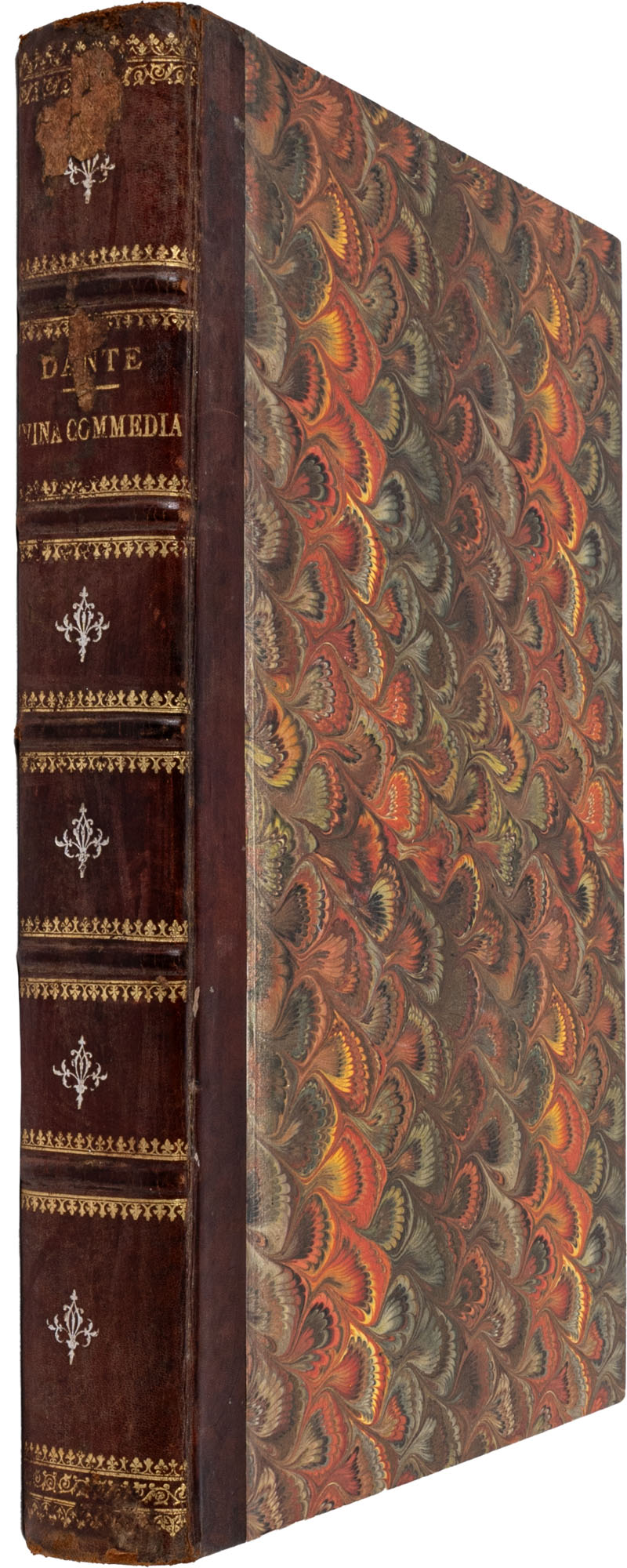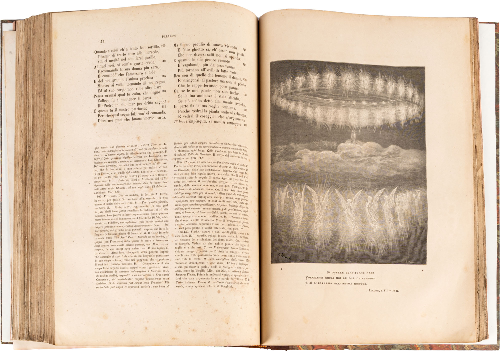 ALIGHIERI DANTE (A CURA DI EUGENIO CAMERINI) - LA DIVINA COMMEDIAMilano, SONZOGNO, 1868Legatura in mezza pelle coeva, titolo e fregi oro al dorso (a cordoni), pp. 136; 132; 132. Riccamente illustrato da 97 incisioni a piena paginaIn-folio (mm. 410 x 290)Le prime e le ultime pagine presentano vistosi aloni e bruniture, peraltro testo in buono stato di conservazione