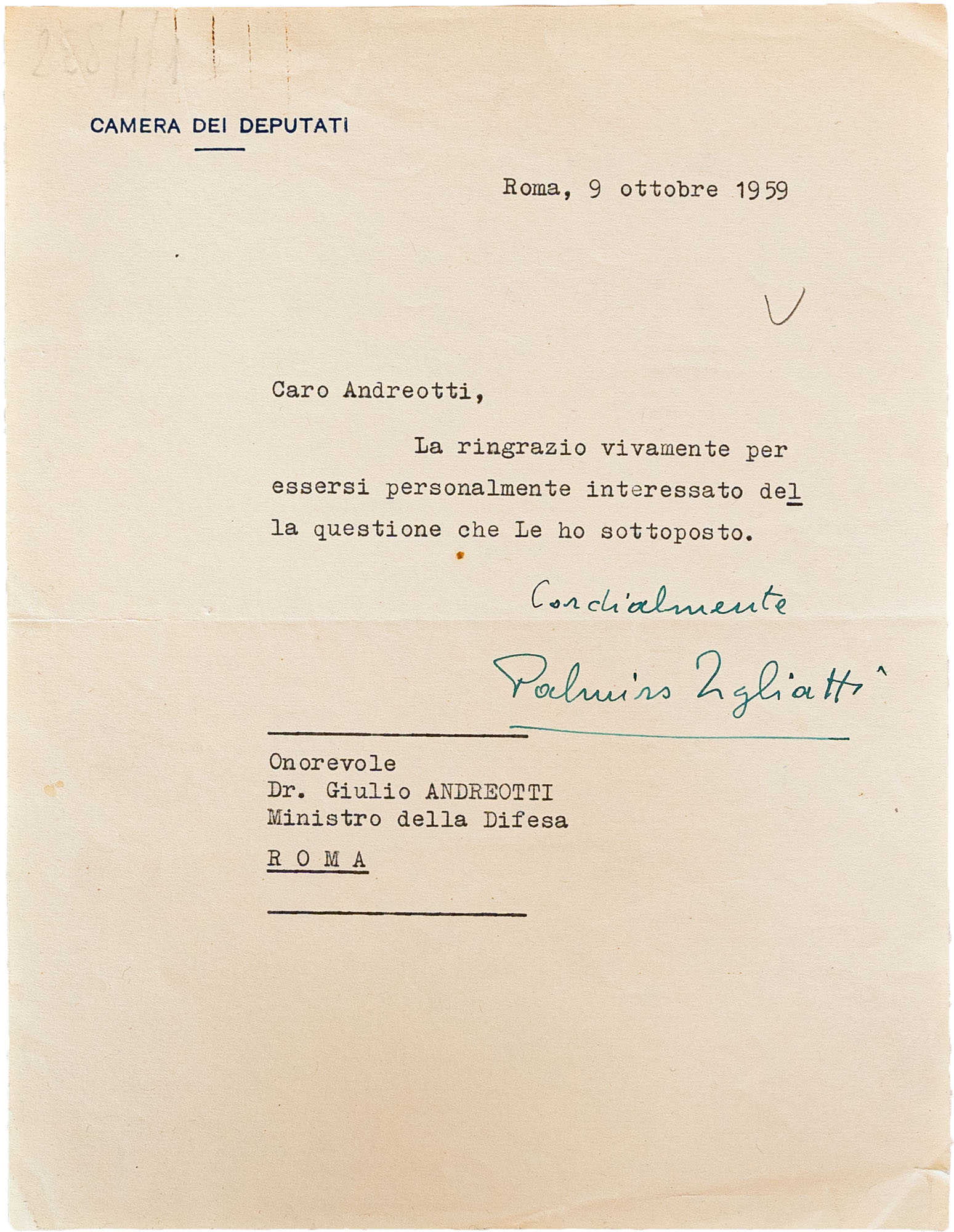 Palmiro Togliatti - Lettera personale dattiloscritta con saluti e firma autografa, indirizzata all'onorevole Giulio AndreottiRoma, 1959Condizioni ottime