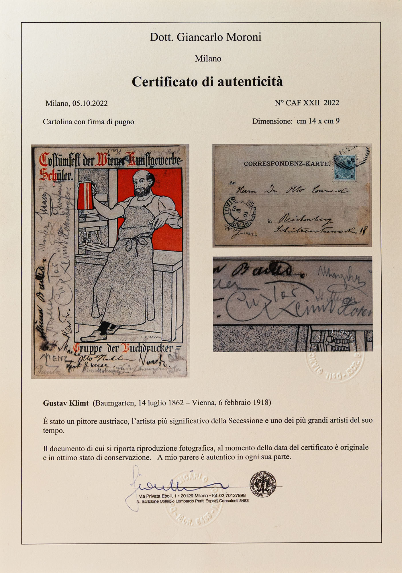 Gustav Klimt - Cartolina indirizzata al dottor Otto Conrad con la firma autografa del grande artista austriaco sul lato lungo di sinistraDa Vienna a Reichenberg 1901'Gruppe der Buchdrucker', Gruppo di stampatori di libri''Costumfest der Wiener Kunstgewerbeschule', Festival dei costumi della Scuola di Arti Applicate di ViennaProbabilmente anche gli altri firmatari erano allievi del destinatarioRarissimi gli autografi di Gustav KlimtCondizioni ottime
