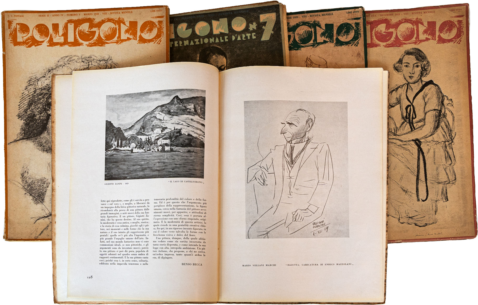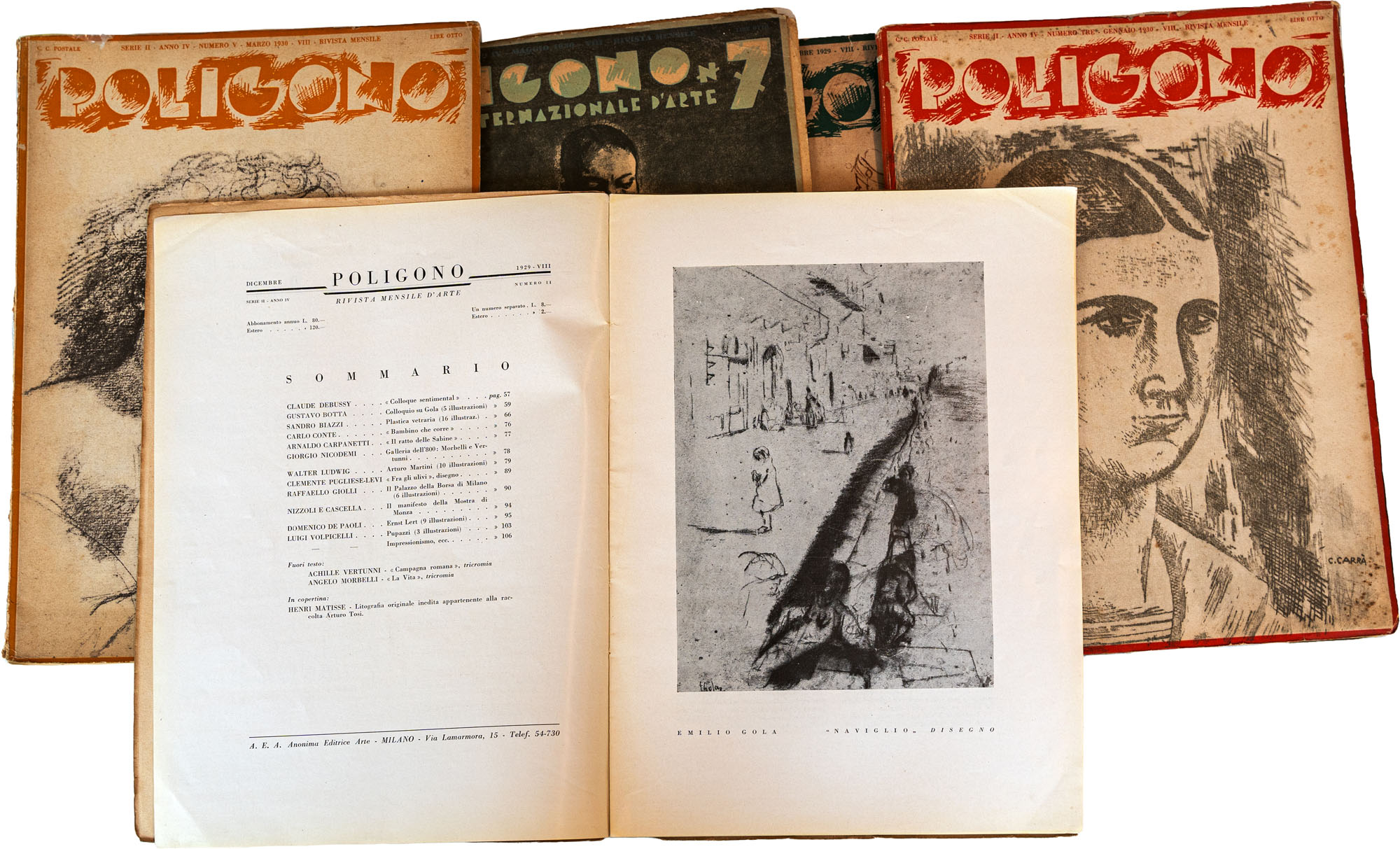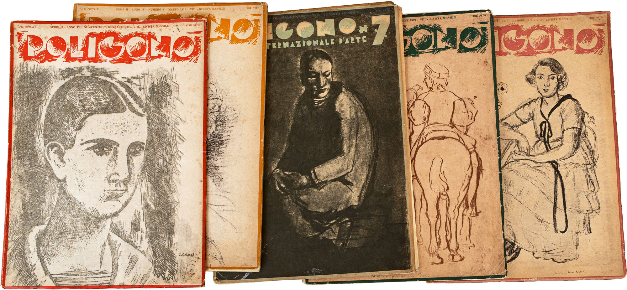 Poligono - Rivista mensile arteEditore: Anonima Editrice ArteLotto di 5 copie del 1929/1930Cm. 34 x 24La prima rivista italiana di arte contemporanea, fondata da Raffaello Giolli nel 1929In tutti i numeri della rivista compaioni i nomi e le opere dei più grandi artisti italiani dell'epoca, quali: Carrà, Sironi, Modigliani, Bezzi, Wildt, ecc.Condizioni buone
