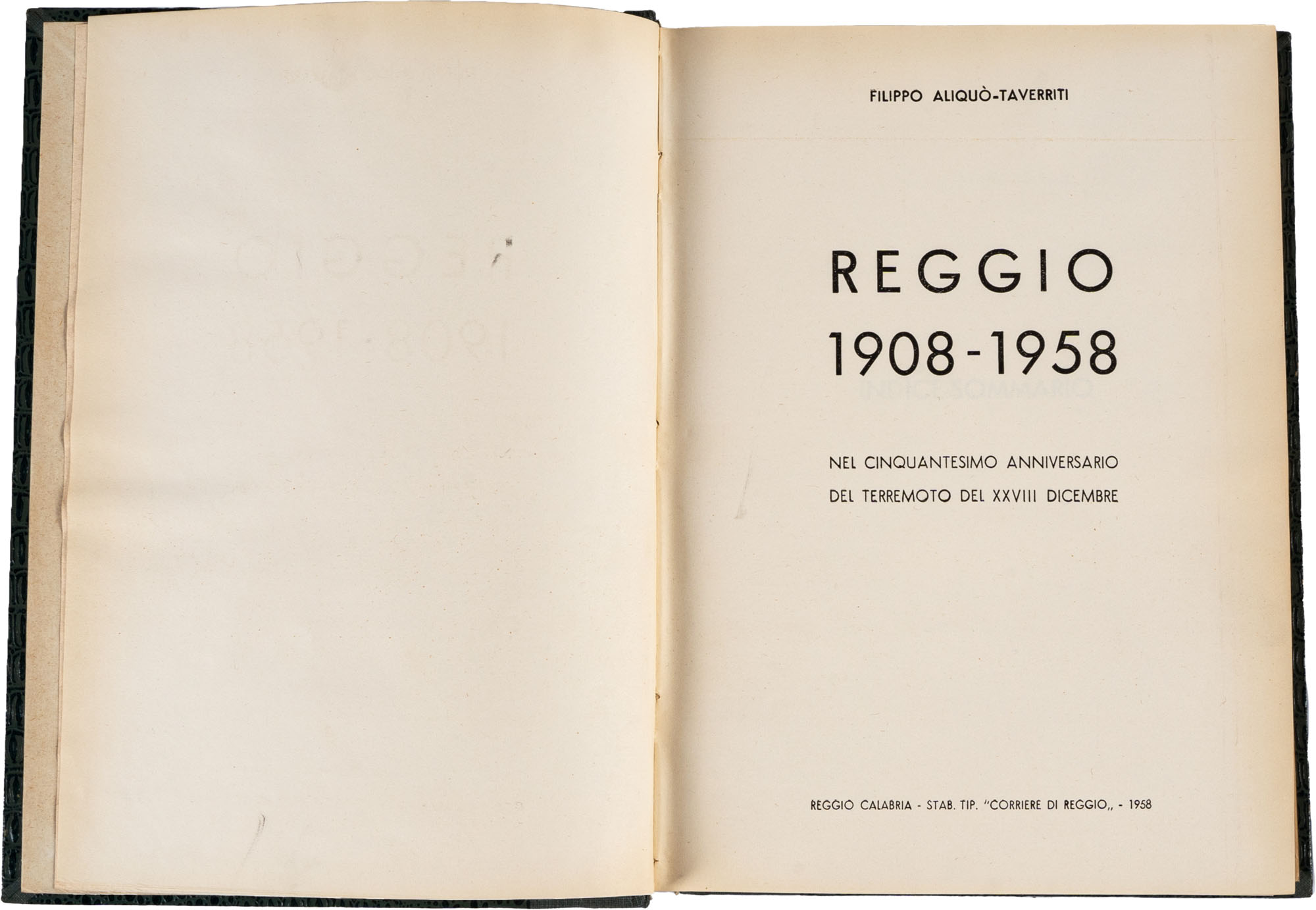 ALIQUÒ-TAVERRITI FILIPPO - REGGIO 1908-1958. NEL CINQUANTESIMO ANNIVERSARIO DEL TERREMOTO DEL XXVIII DICEMBREReggio Calabria, STABILIMENTO TIPOGRAFICO 'CORRIERE DI REGGIO', 1958legatura in mezza tela coeva, titolo oro al dorso, pp. 411, con numerose Illustrazioni e fotografie in bianco e nero fuori dal testoIn-8 p. (mm. 238 x 171)Esemplare in ottimo stato di conservazione