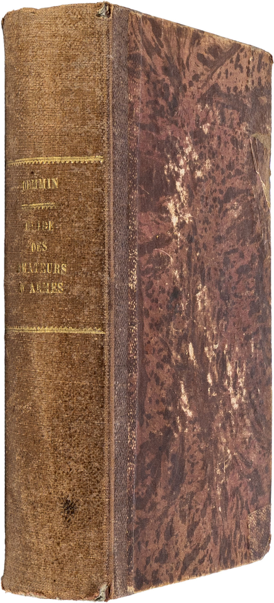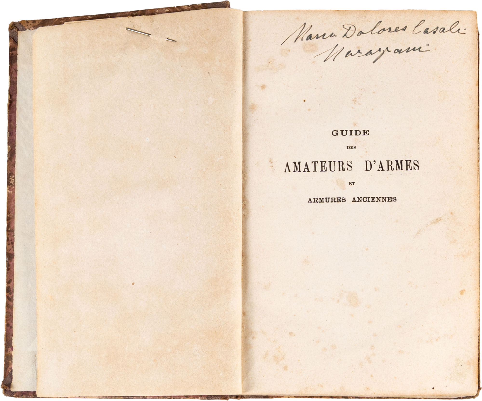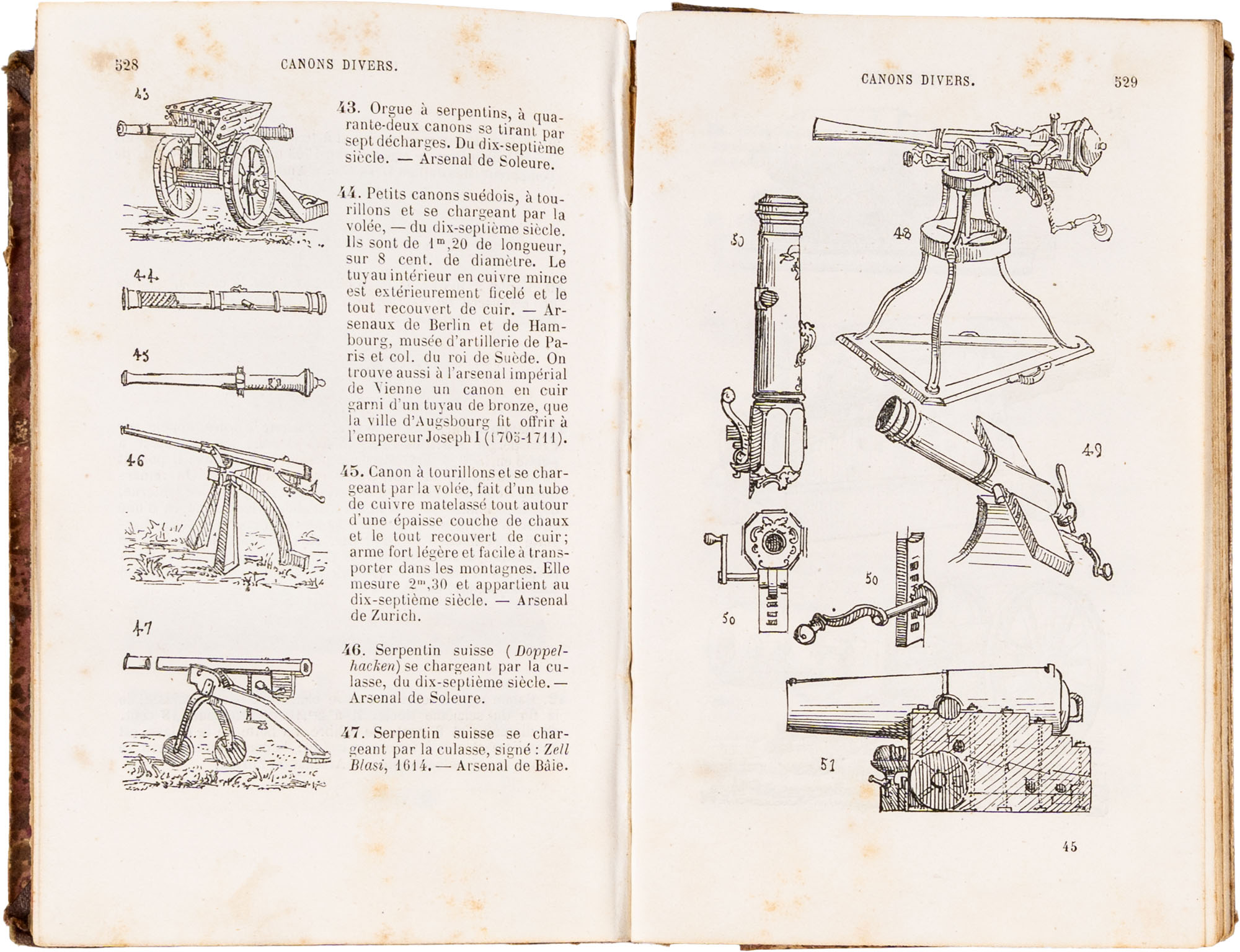 DEMMIN AUGUSTE - GUIDE DES AMATEURS D'ARMES ET ARMURES ANCIENNES PER ORDRE CHRONOLOGIQUE DEPUIS LES TEMPS LES PLUS RECULÉS JUSQU'A NOS JOURSParis, LIBRAIRIE RENOUARD, 1879Legatura in mezza tela coeva, titolo oro al dorso, pp. 628, riccamente illustrato da 1700 riproduzioni grafiche di armi e armature e 200 marchi e monogrammi di armaioliIn-16 gr. (mm. 175 x 111)Esemplare leggermente fiorito, applicati alla prima carta due ritagli di giornale di cui uno reca un'illustrazione di un cannone mentre l'altro indica un processo di lavorazione del metallo, peraltro volume in buono stato di conservazione