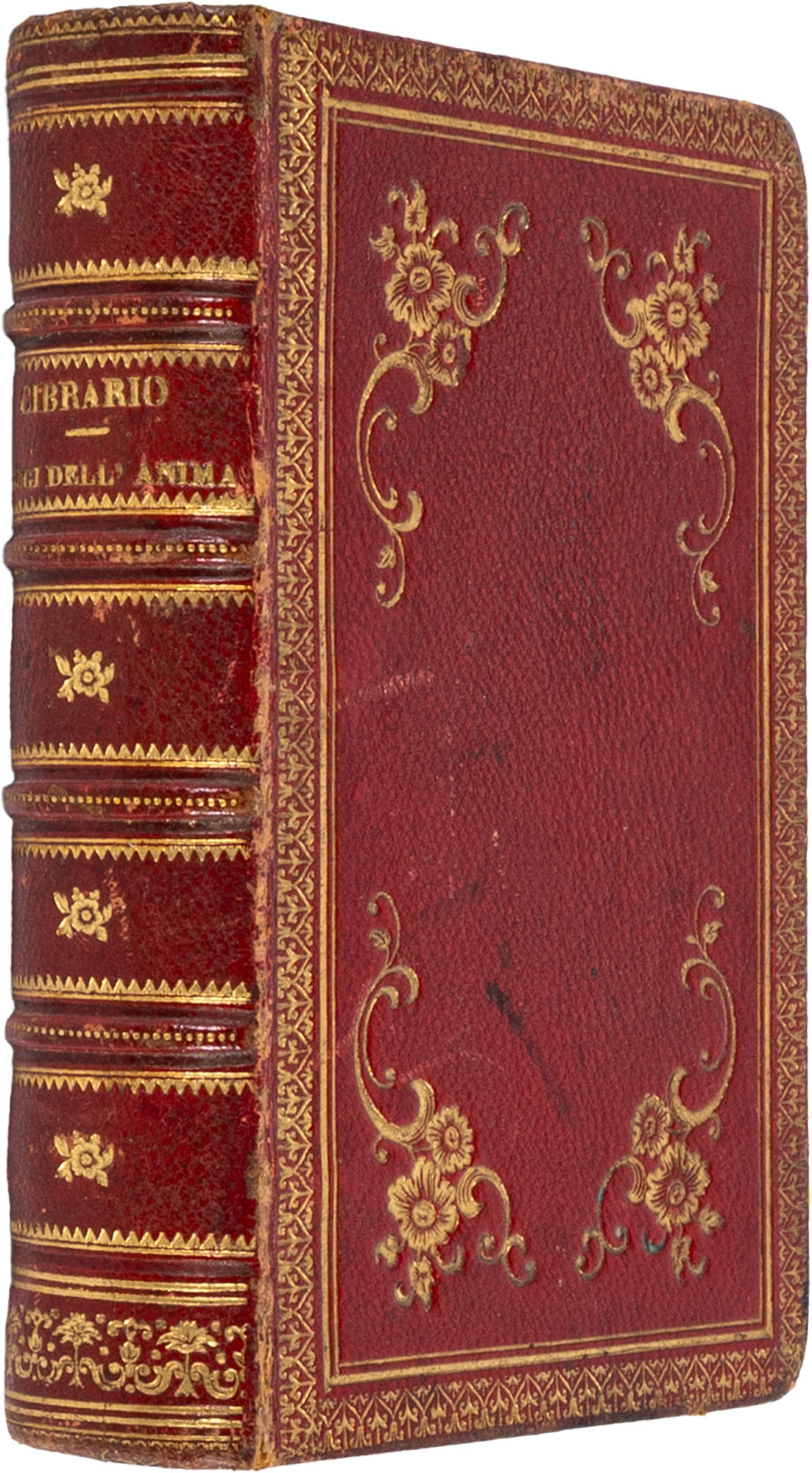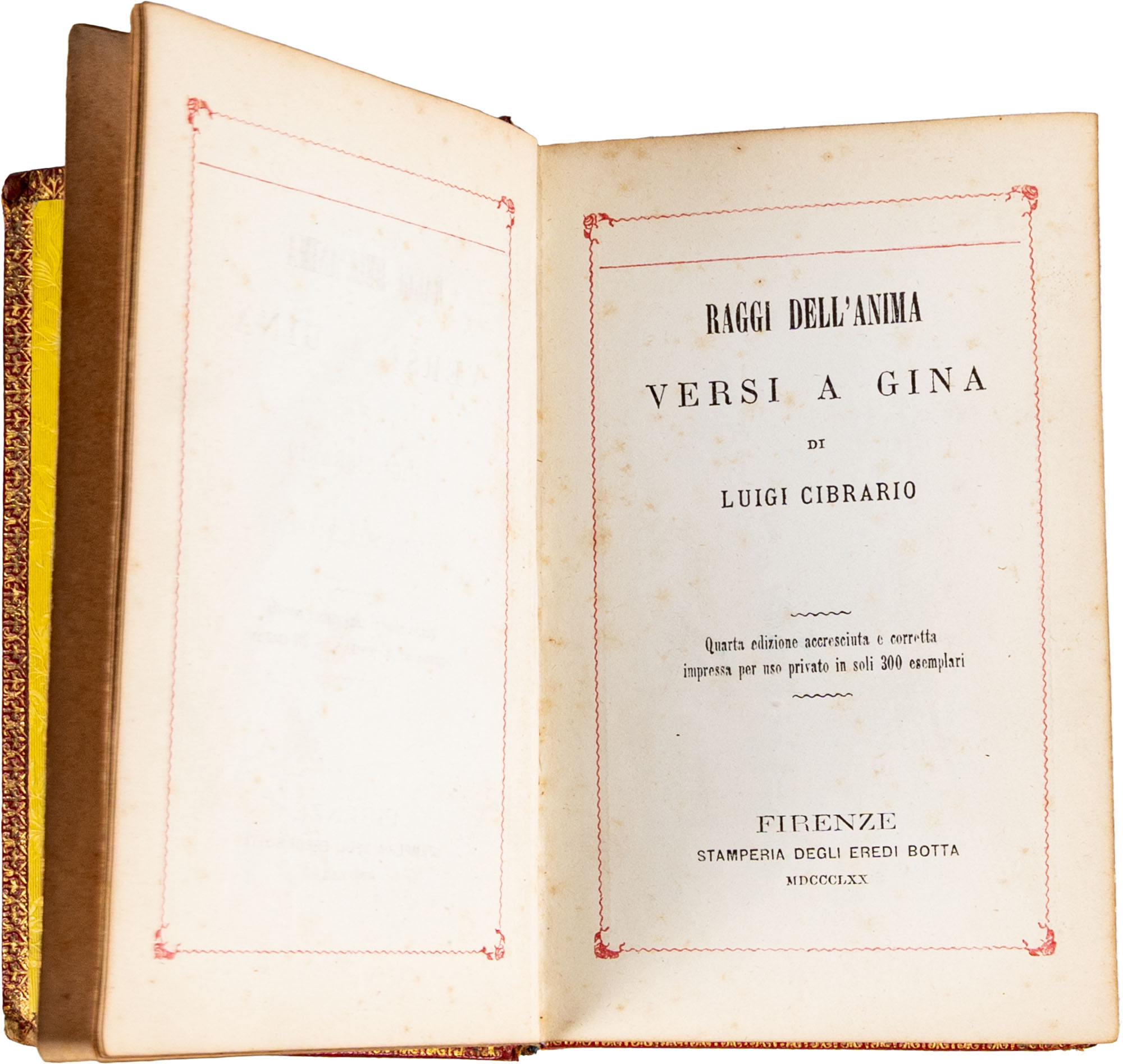 CIBRARIO LUIGI - RAGGI DELL'ANIMA. VERSI A GINAFirenze, STAMPERIA DEGLI EREDI BOTTA, 1870Legatura in piena pelle coeva con bei fregi e decorazioni in oro ai piatti, titolo e decorazioni oro al dorso (a cordoni), tagli dorati, risguardi in bella carta goffrata, pp. 281In-24 gr. (mm. 130 x 81)Esemplare in buono stato di conservazione
