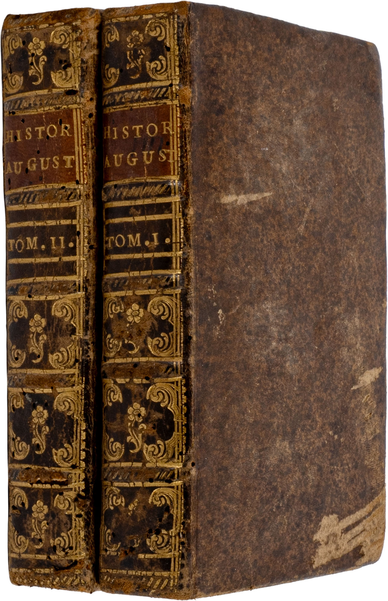 HISTORIAE AUGUSTAEFlorentiae, APUD TARTINIUM & FRANCHIUM, 17252 volumi, legatura in piena pelle coeva, titolo (in tassello) e fregi oro al dorso (a cordoni), tagli marmorizzati rossi, pp. (8), 502; 525In-16 (mm. 171 x 108)Lievi segni del tempo sulla copertina, peraltro esemplari in buono stato di conservazione