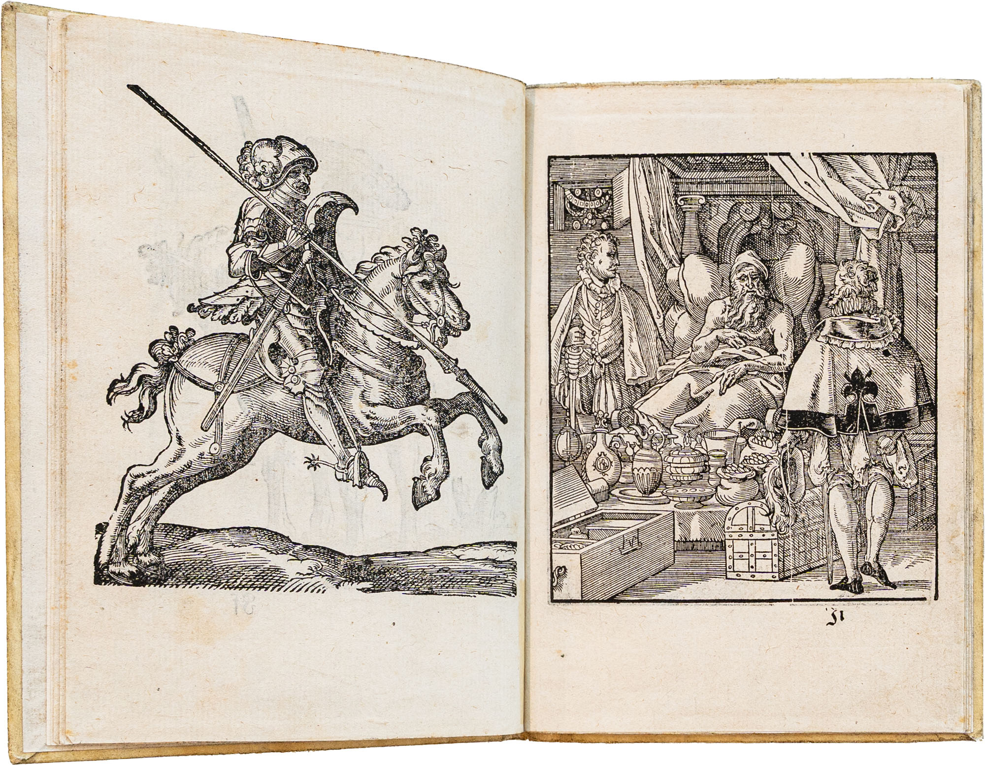 Jost Amman (1539-1591) - Pferdeszenen (scene di cavalli) e altri soggetti32 xilografie raccolte in un libretto di 15 pagine +2 b. Con legatura in pergamena non coevaIn 16° (cm. 17,5 x 12,5)Ottime condizioni