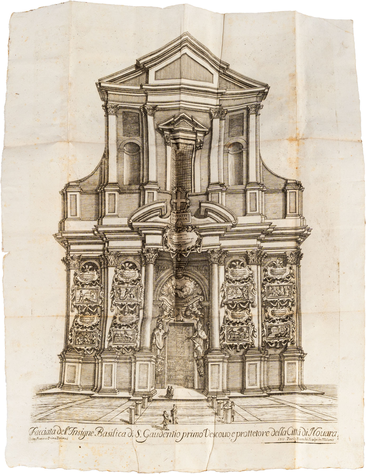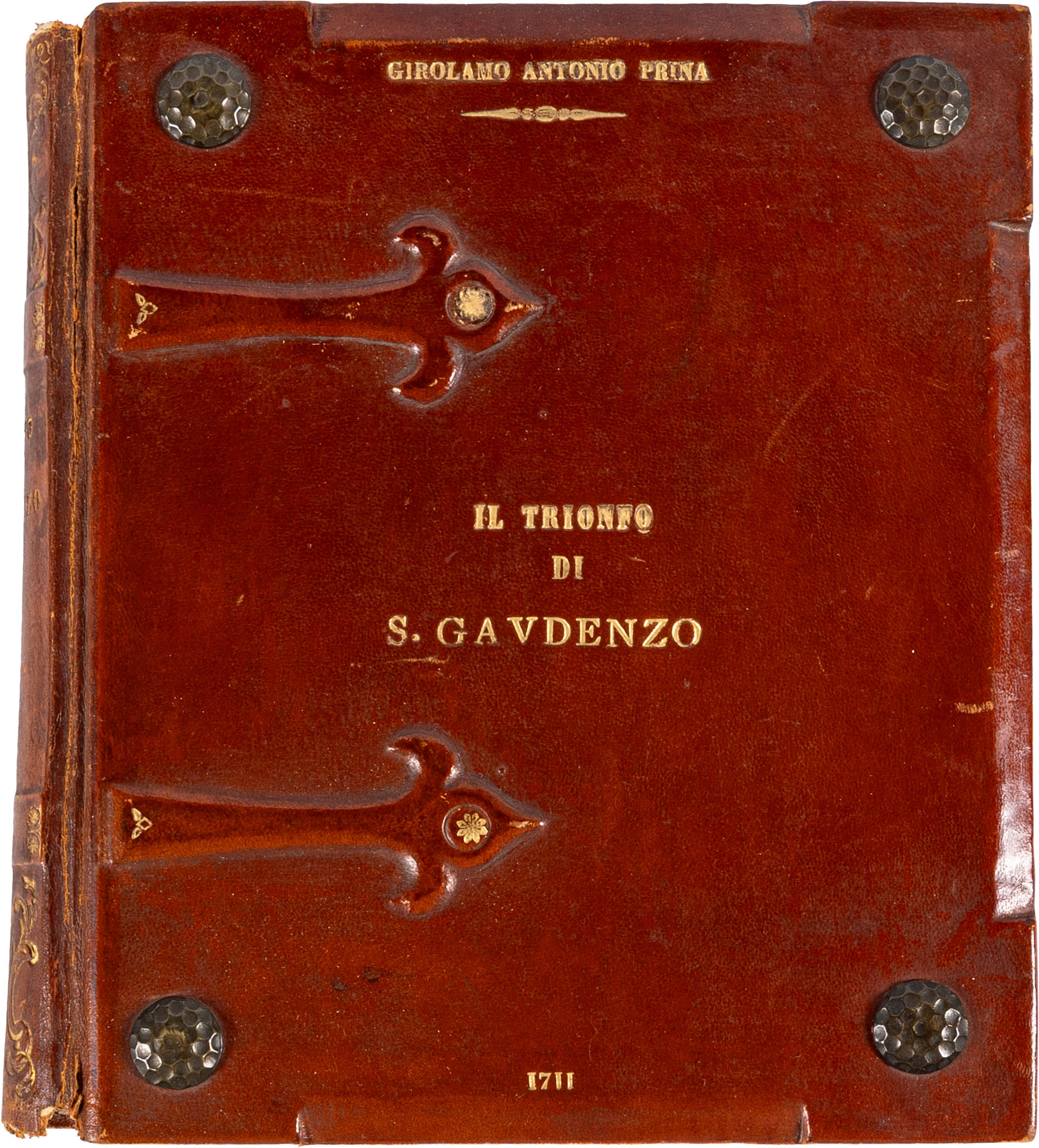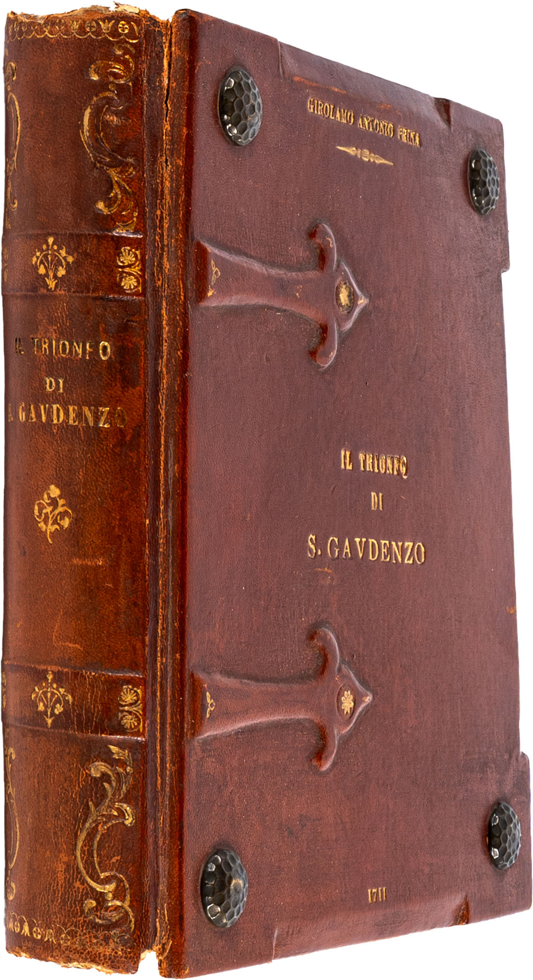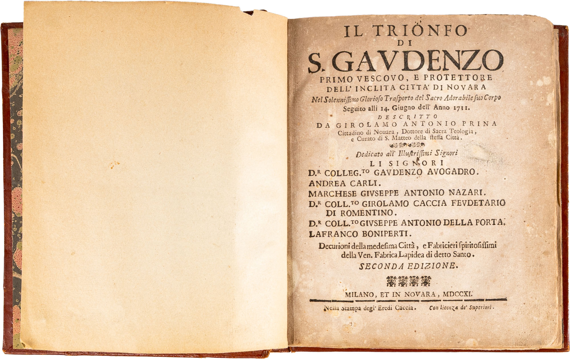 PRINA GIROLAMO ANTONIO - IL TRIONFO DI SAN GAUDENZO primo vescovo e protettore dell'inclita città di Novara nel solennissimo glorioso trasporto del sacro adorabile suo corpo seguito alli 14 giugno dell'anno 1711In Milano: per Marc'Antonio Pandolfo Malatesta, 1711Pag. [8], 1545 grandi tavole di Novara più volte ripiegate con qualche difetto, testatine e capilettera nel testoIn 4°Condizioni generali molto buone