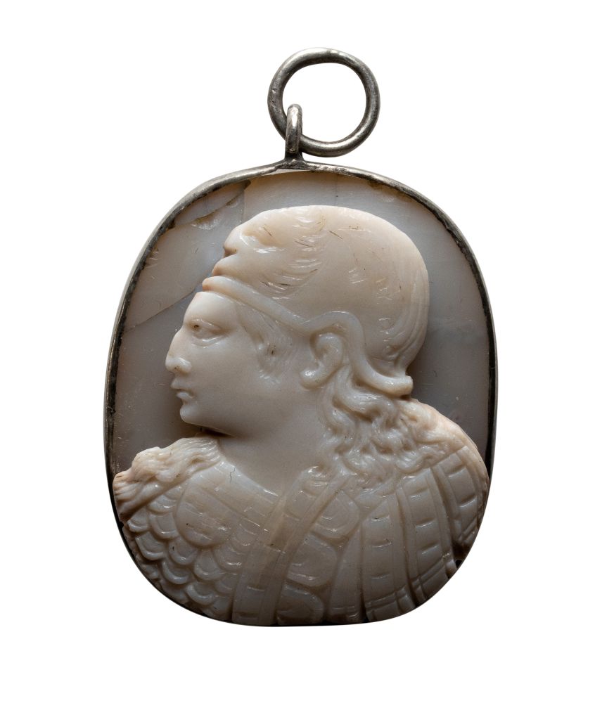 A large Late Renaissance agate cameo set in a silver pendant. Bust of Athena. The goddess is depicted with a three-quarter bust and an helmeted head in profile. She wears a sturdy armor with the gorgoneion. Her profile is marked, with sculptural features. The helmet shows a chiseled decoration with fantasy motifs on it. The cameo is partly damaged and restored frontally, in the background, but the stone is solid in the ancient silver mount. A piece of generous dimensions, characterized by the typical transitional style between the late Renaissance and the Baroque. End of 16th century- early 17th 32 x 37 mm; 18,70 gr.