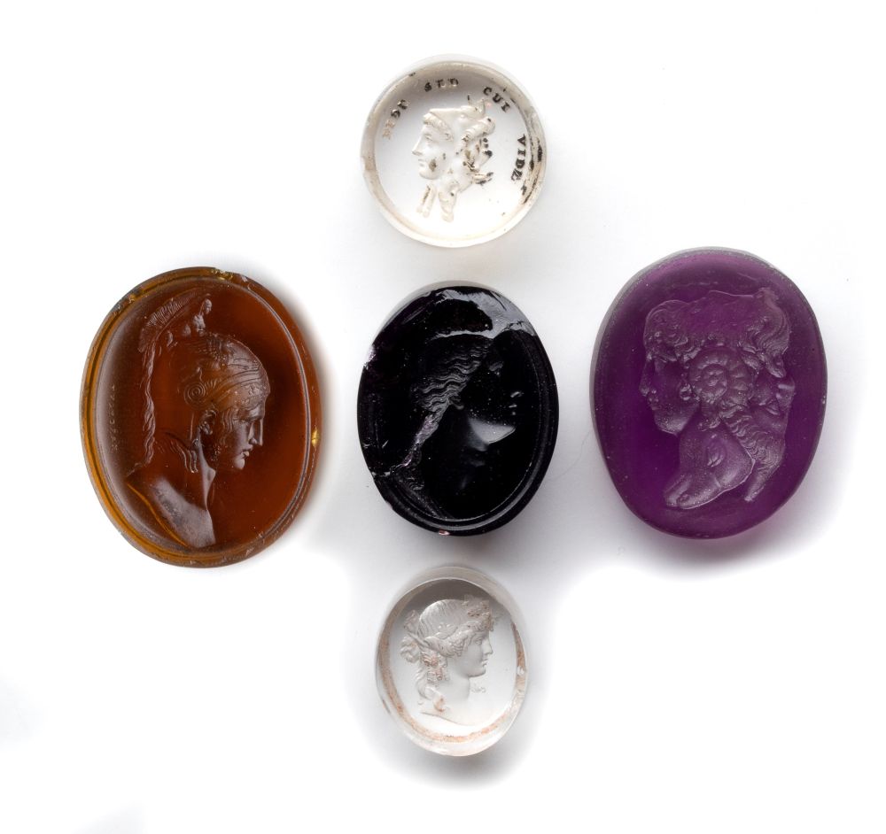 A lot of 5 Grand Tour glass cast impressions. Various subjects. Transparent glass : Gryllos with warning inscription "FIDE SED CUI VIDE"; orange glass: bust of Achilles signed MARCHANT (taken from a sard intaglio by N. Marchant, British Museum n. inv. 1879,0705.20); dark purple glass: female bust (damaged); light purple glass (amethyst shade): gryllos; transparent glass: bust of Dionysus. Grand Tour era. Late 18th-early 19th century. min. 16 x 20 mm; max. 24 x 30 mm