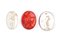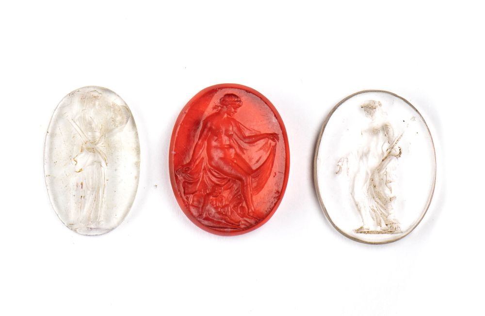 A lot of 3 Grand Tour glass cast impressions. Various subjects. Transparent glasses: a Bacchante; a Muse. Reddish glass: Venus with Eros. Late 18th-early 19th century. Min. 13 x 21 x 2 mm; Max. 17 x 21 x 2 mm
