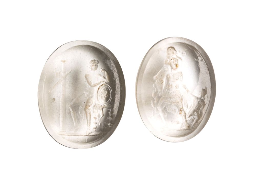A lot of 2 Grand Tour glass cast impressions. Various Subjects. In transparent glass: a warrior; Aeneas's escape from Troy. Late 18th-early 19th century. Min. 11 x 15 x 5 mm; Max. 13 x 16 x 5 mm