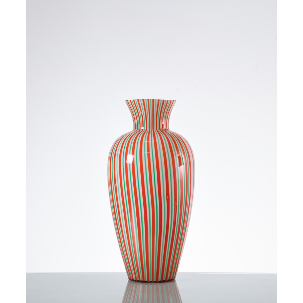 Vaso in vetro lattimo a canne rosse e verdi, corpo ovalizzato, collo a vaso, bocca piana. Sbeccatura al bordo.