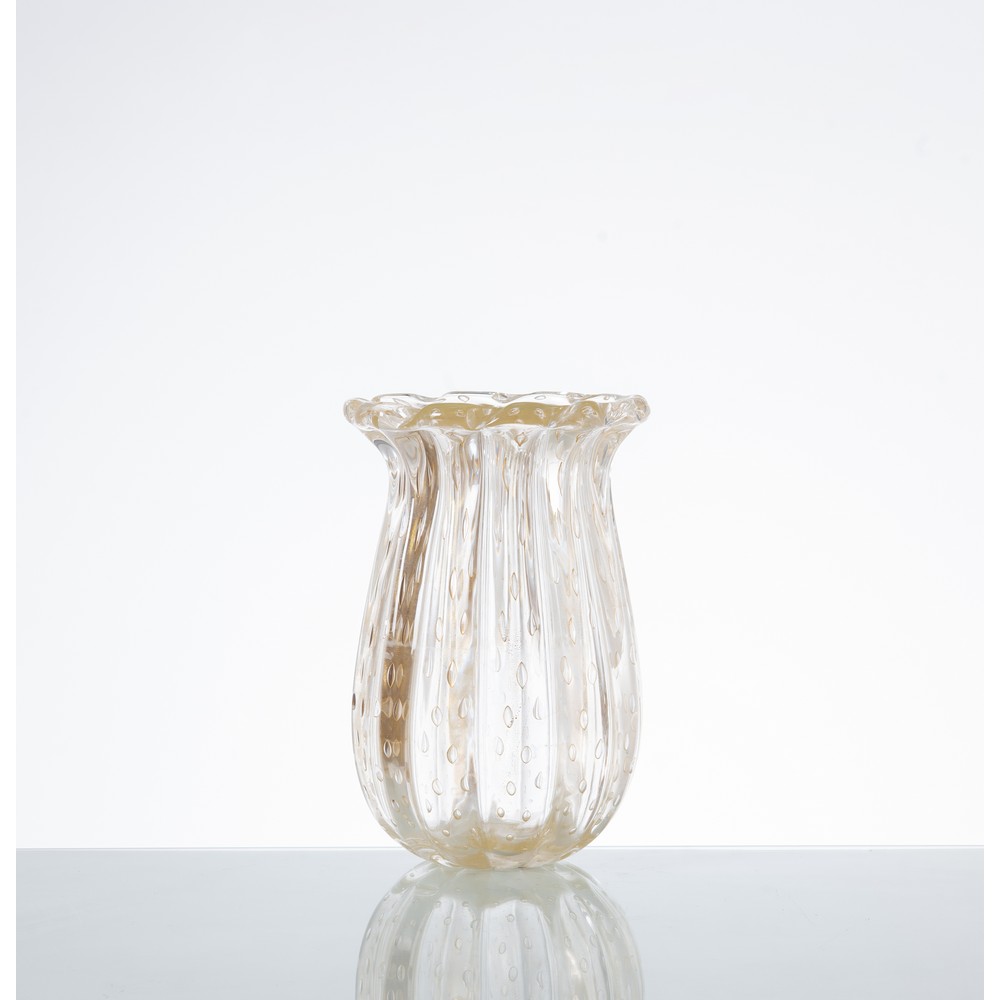 Vaso in vetro costolato e bullicante con decoro di foglia oro sommersa, corpo ovalizzato con bocca ondulata. Firma a graffio.