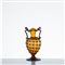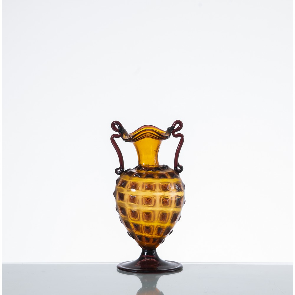 Vaso in vetro soffiato giallo, corpo ad anfora con bugnature rosso ruggine, bocca ondulata, anse applicate a ricciolo.
