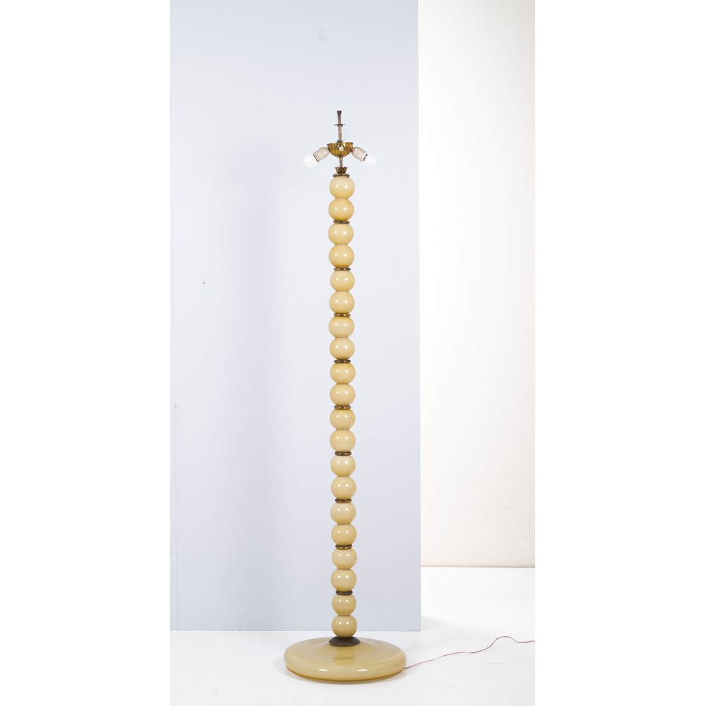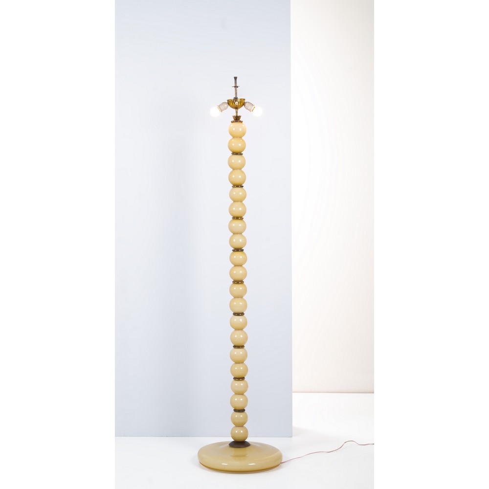 Lampada da terra a due luci, struttura in metallo rivestita da sfere in vetro opalino avorio, dischi separatori in ottone, base circolare in vetro. Diffusore in tessuto mancante.