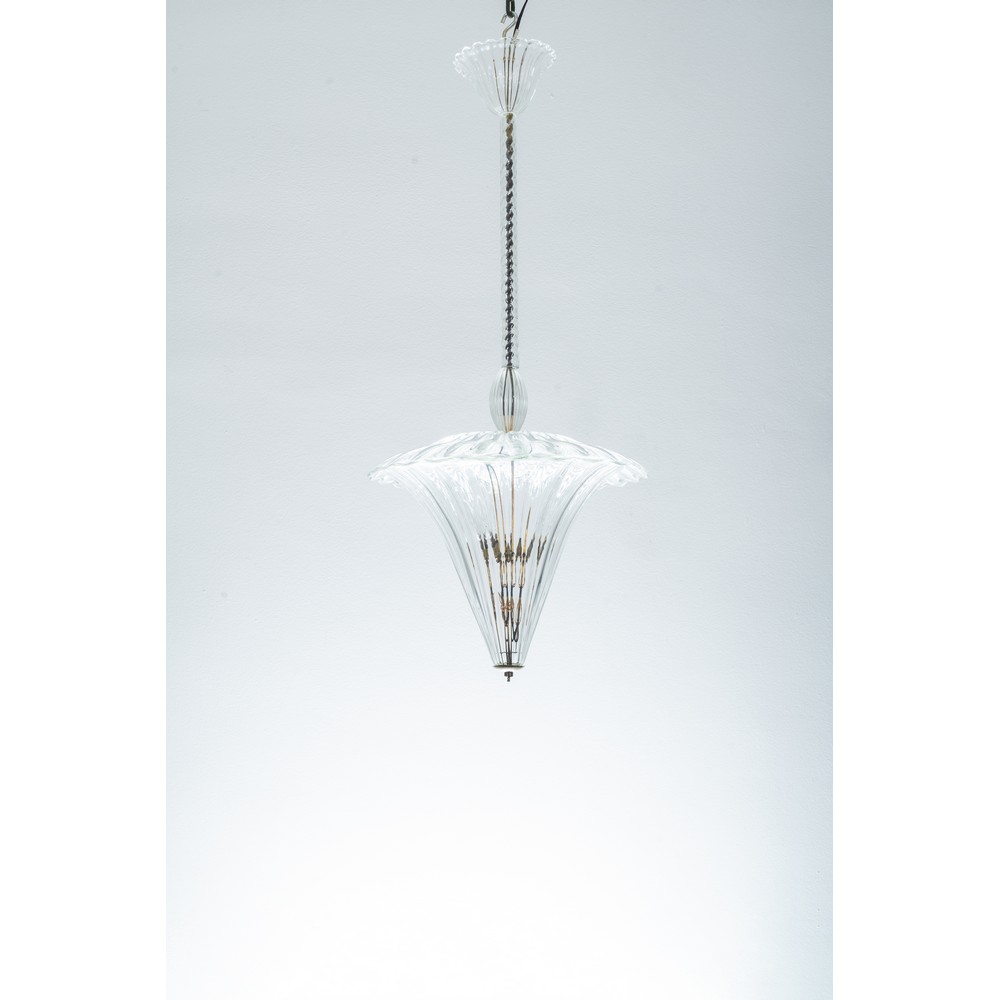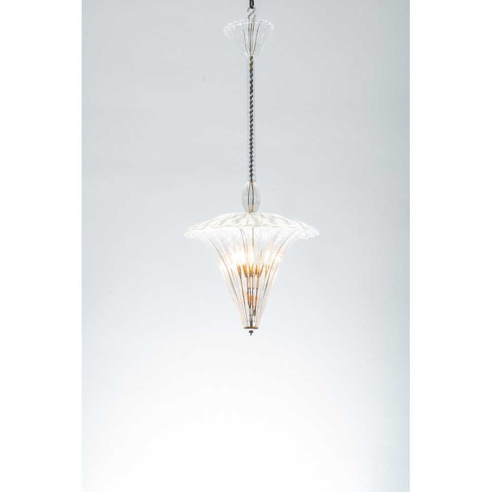 Lampada a sospensione a tre luci, struttura in metallo dorato con diffusore a campana rovescia in vetro costolato incolore, fusto in vetro cordonato, elementi di giunzione in vetro. Lieve difetto al collo di elemento decorativo di giunzione.