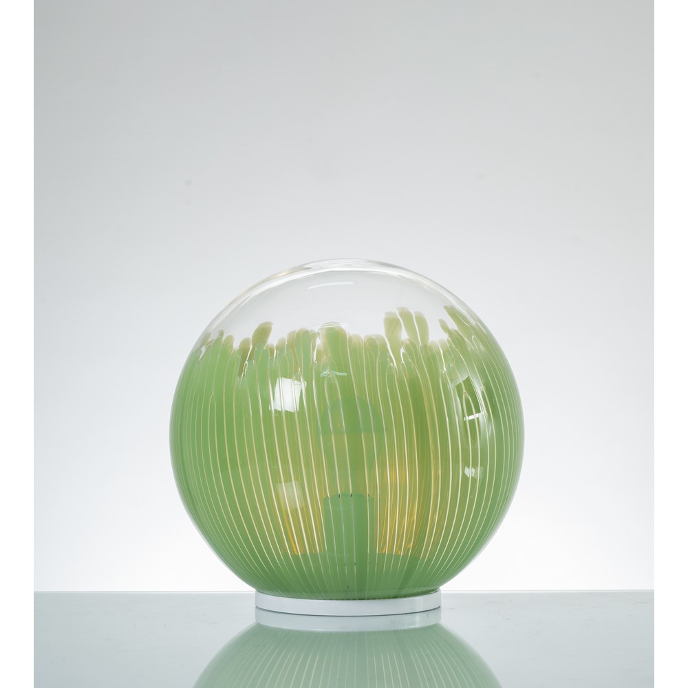 Lampada da tavolo ad una luce modello “Anemone”, struttura in metallo cromato con diffusore globulare in vetro soffiato con inclusione di vetro a canne verdi. Marchio incusso.