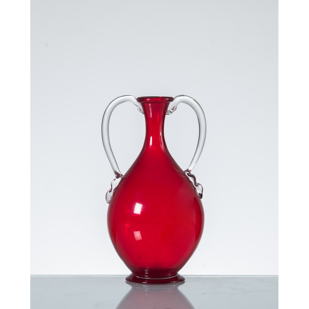 Vaso ad anfora modello “1695C” in vetro rosso con manici curvi in vetro incolore, base circolare.