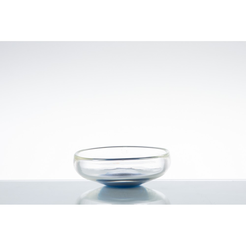 Coppa in vetro incolore con decoro blu sul fondo, corpo circolare con bocca piana.