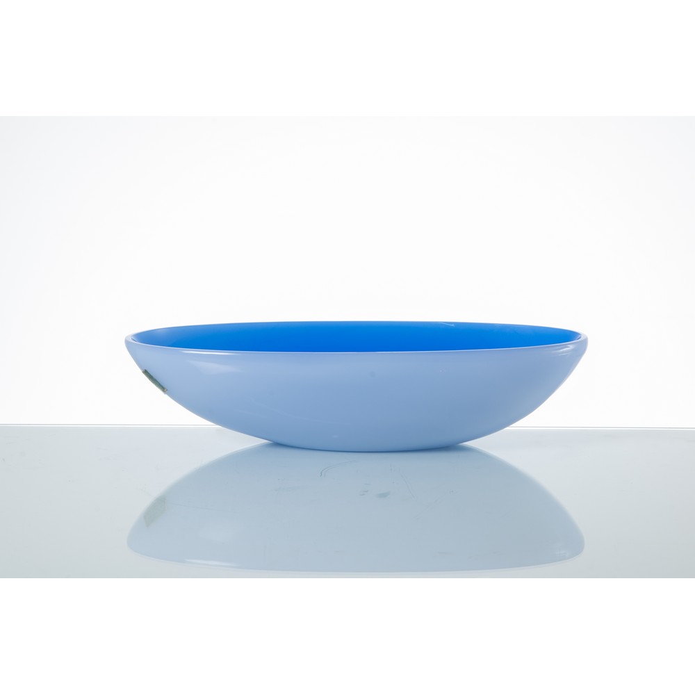 Centrotavola in vetro incamiciato celeste e blu, corpo a coppa ovalizzata con bocca piana. Etichetta.