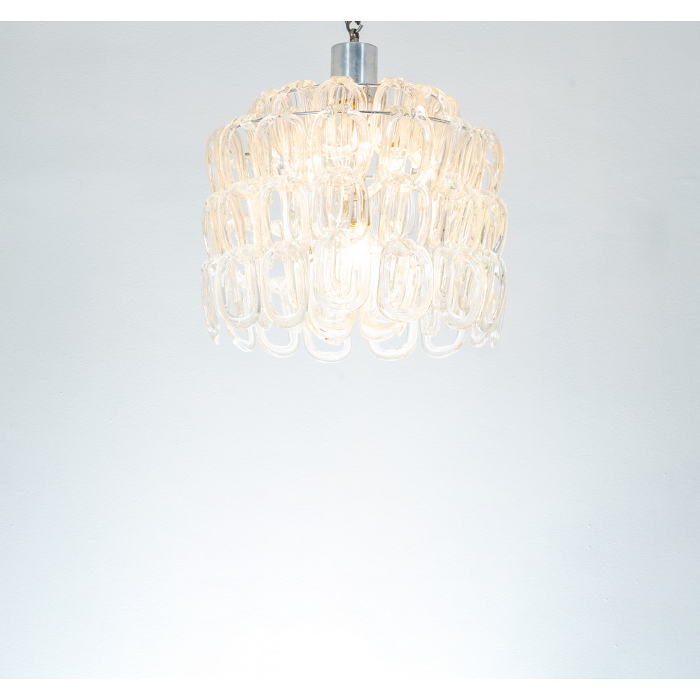 Lampada a sospensione a quattro luci modello “Giogali”, struttura in metallo cromato con diffusore composto da maglie concatenate in vetro trasparente e lattimo.