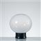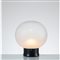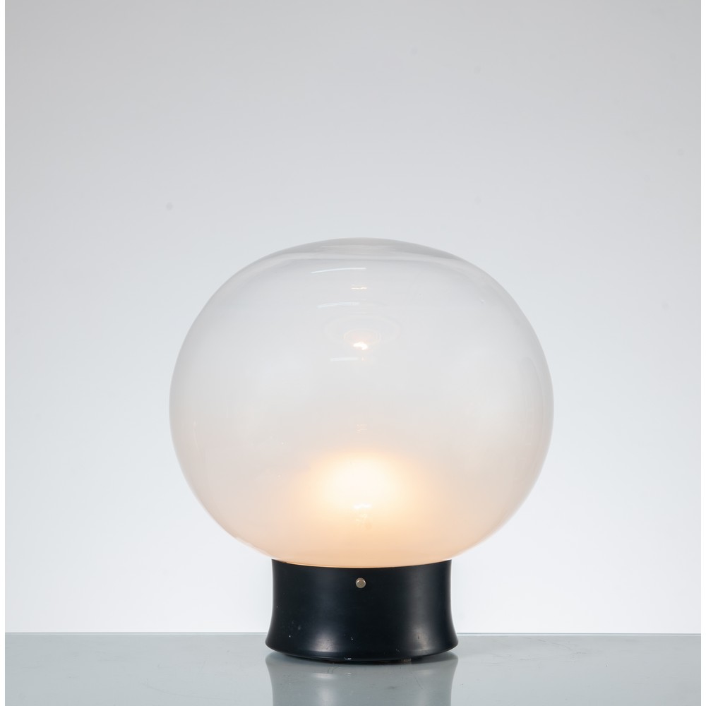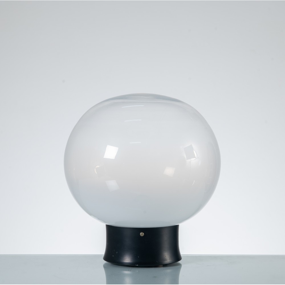Lampada da tavolo ad una luce, struttura cilindrica in metallo verniciato nero, diffusore sferico in vetro parzialmente incolore e lattimo.