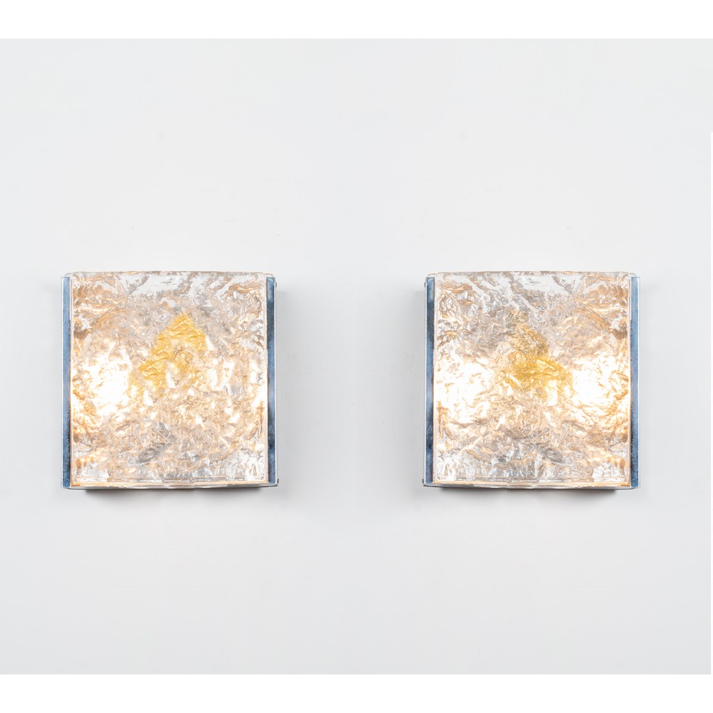 Coppia di lampade da parete a due luci, struttura in metallo con diffusore rettangolare in vetro corteccia incolore e ambra.